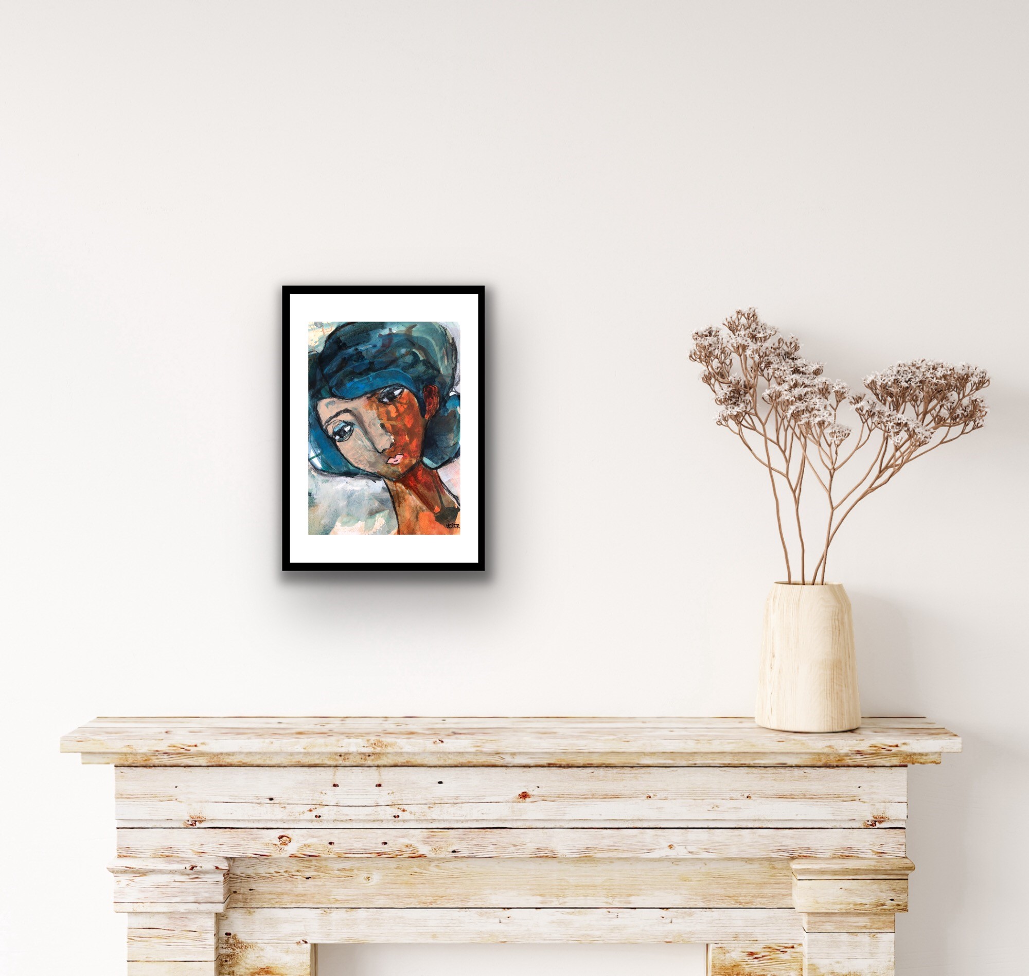 Monteret i passpartout og sort træramme med akryl glas.