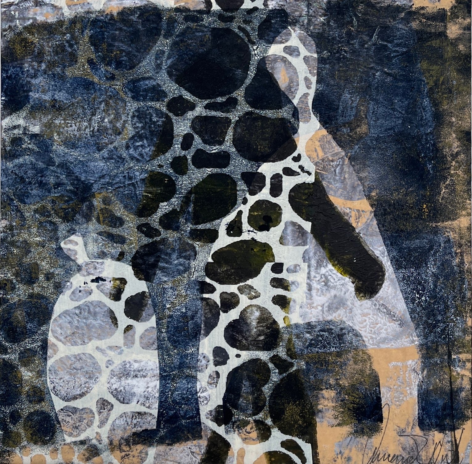Monoprint et original kunstværk. Lag på lag tryk, på papir.