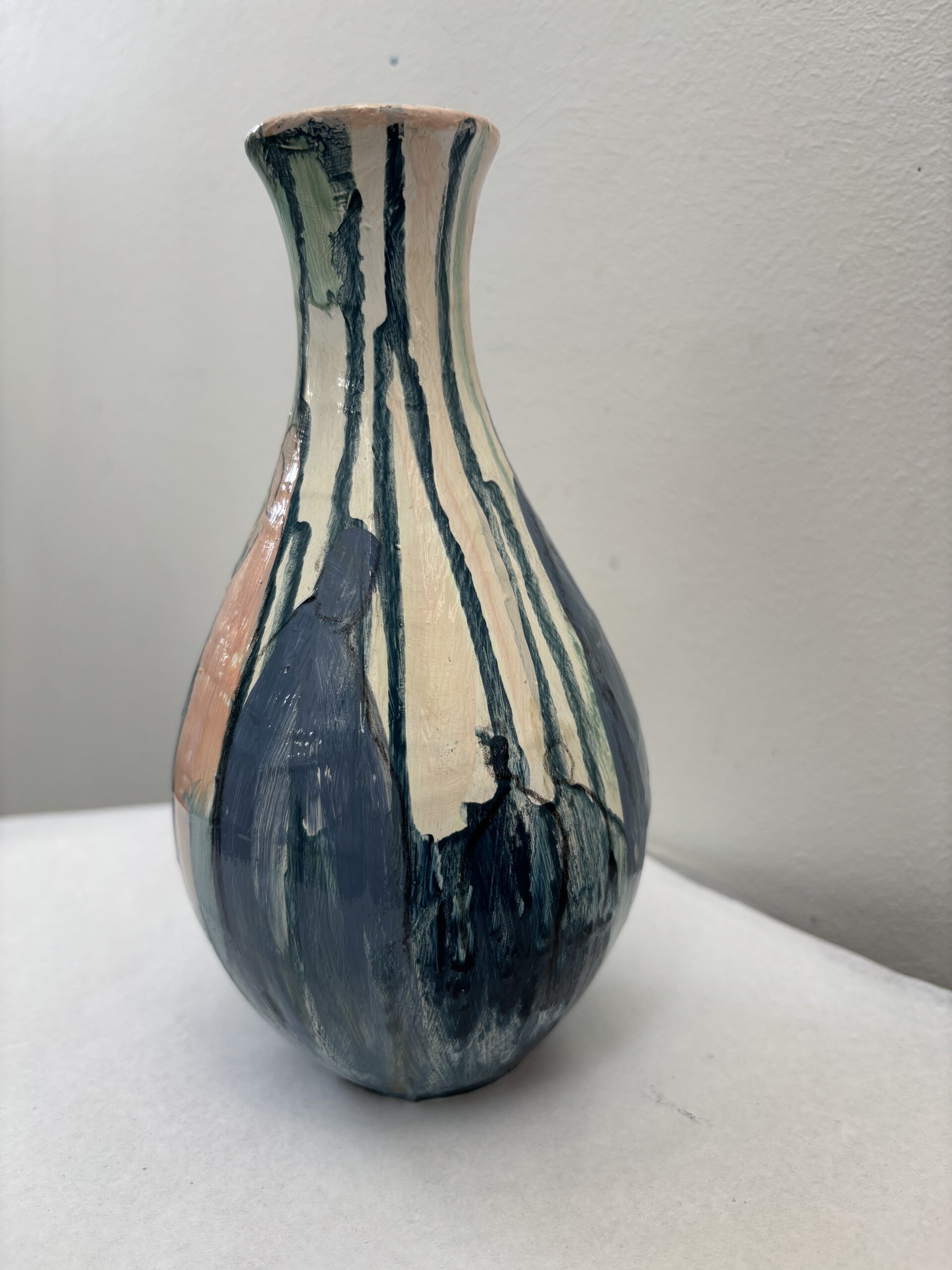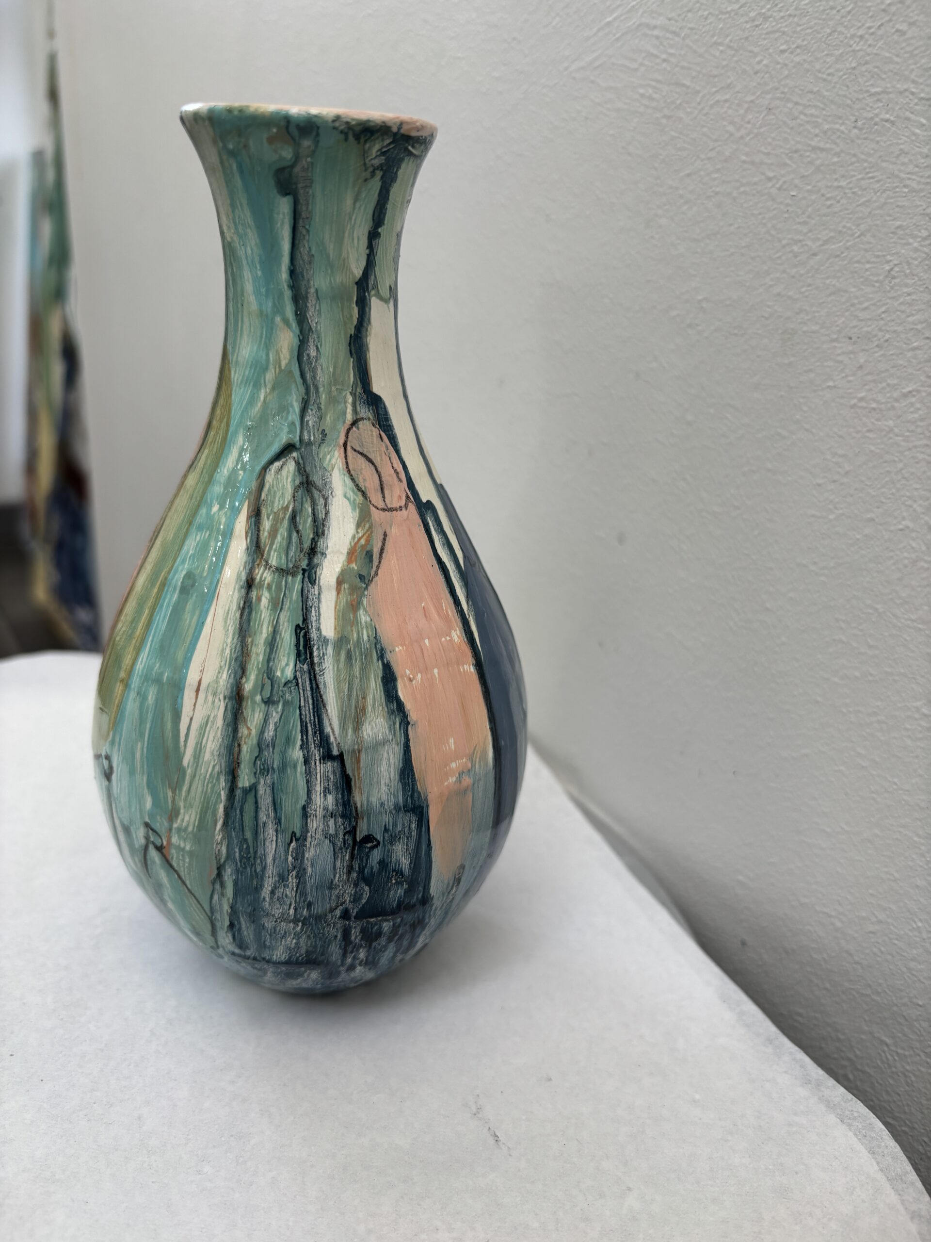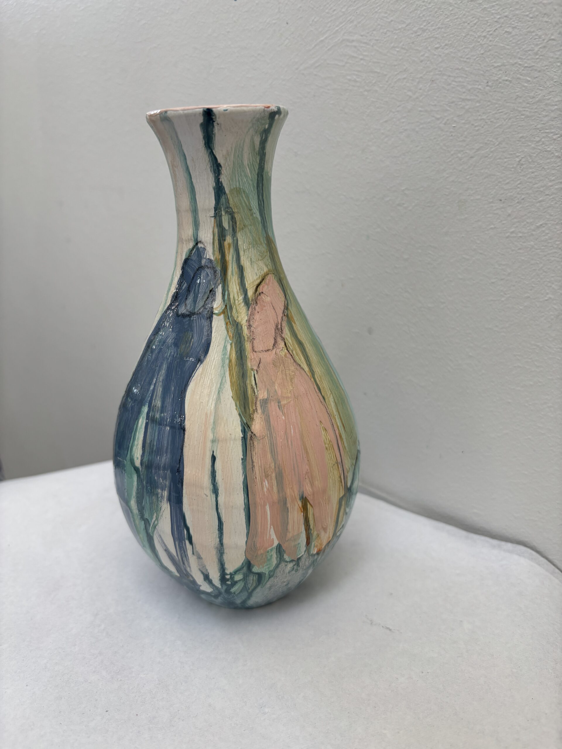Vasen er i et farvespil med rødlige og orange nuancer med enkelte motiver.