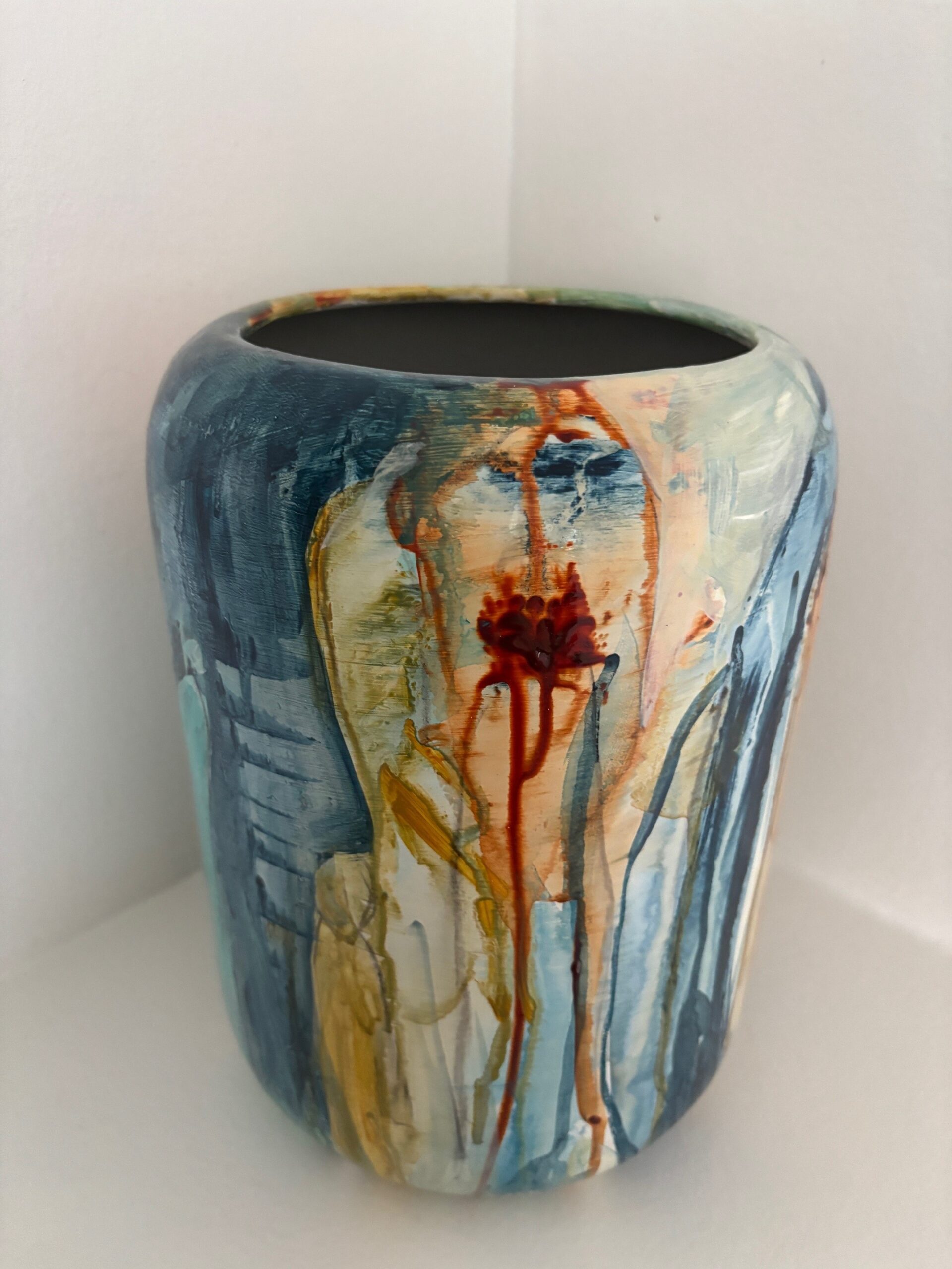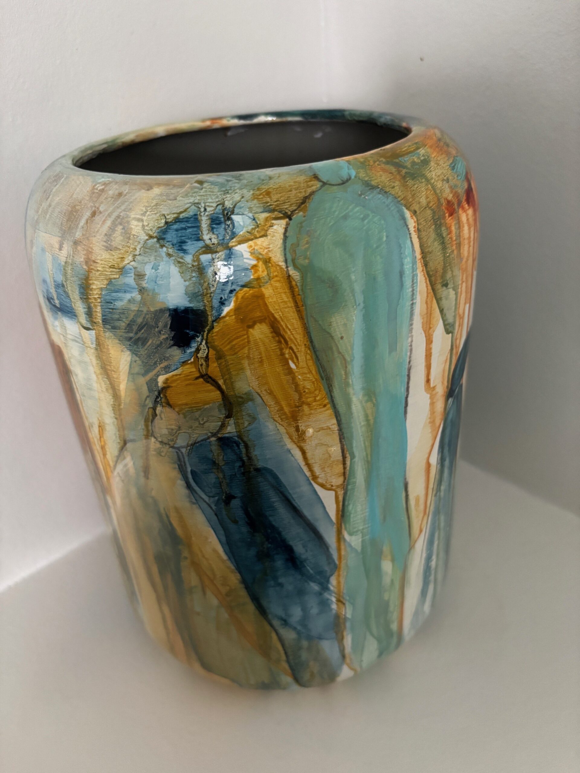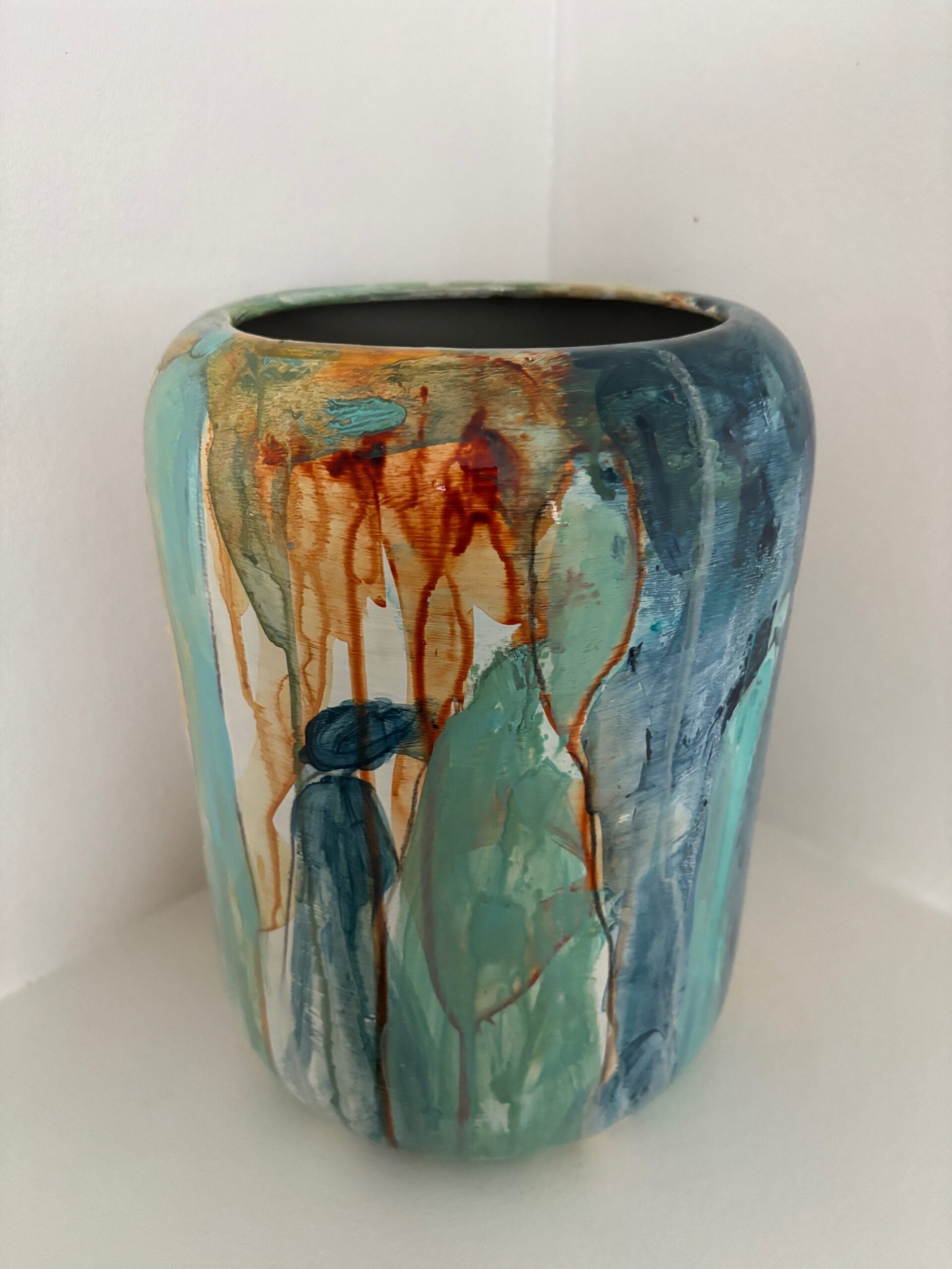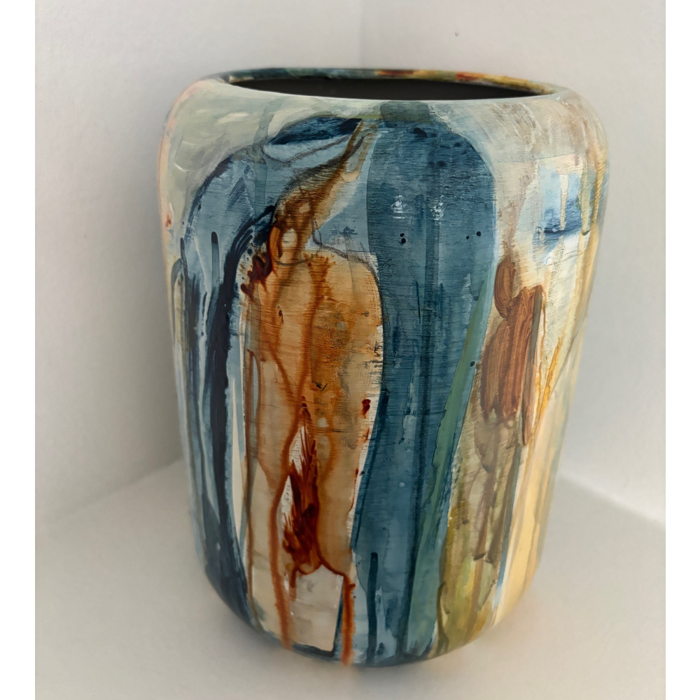 Vasen er i et farvespil med grønne, blå, orange og brune nuancer med enkelte motiver.