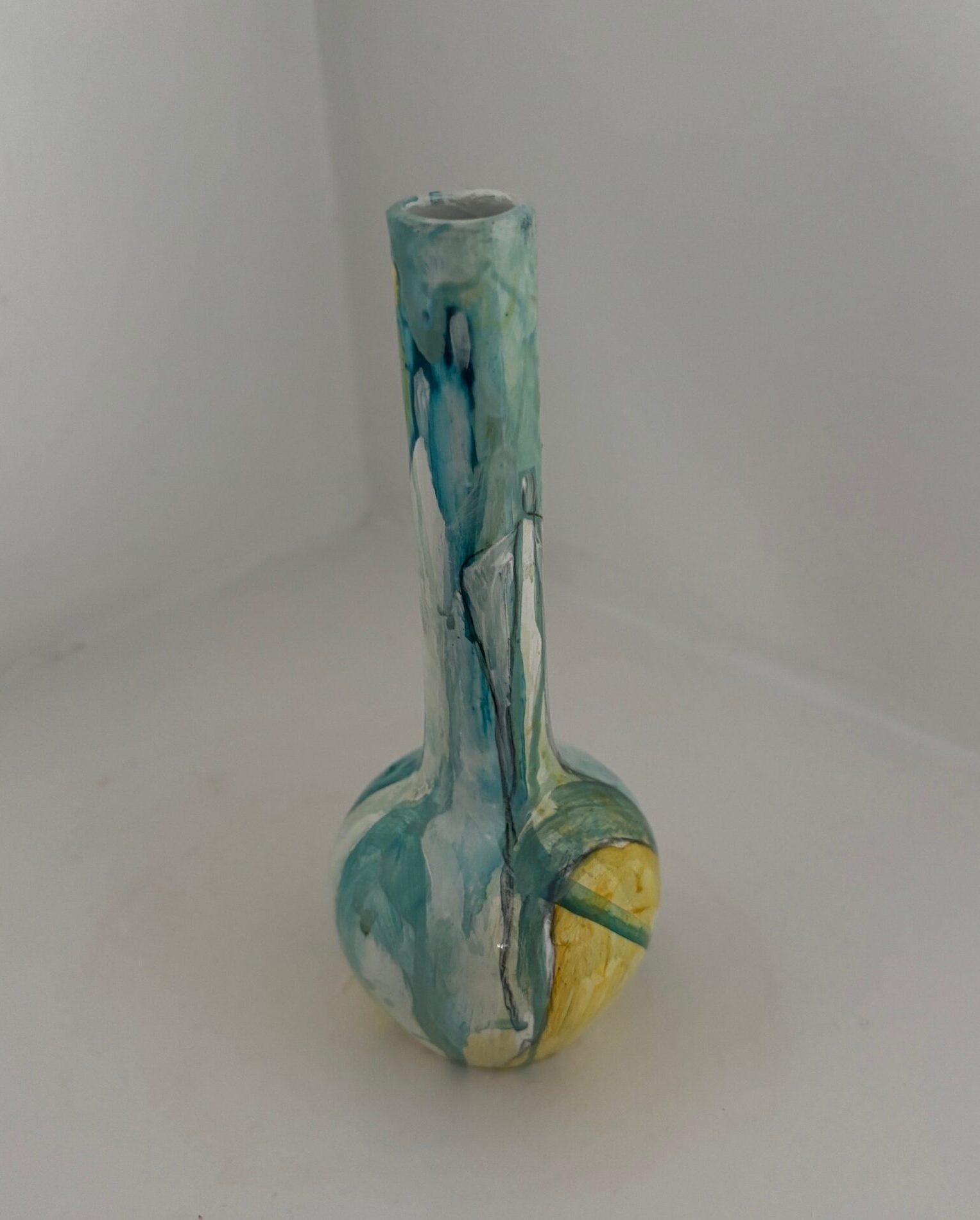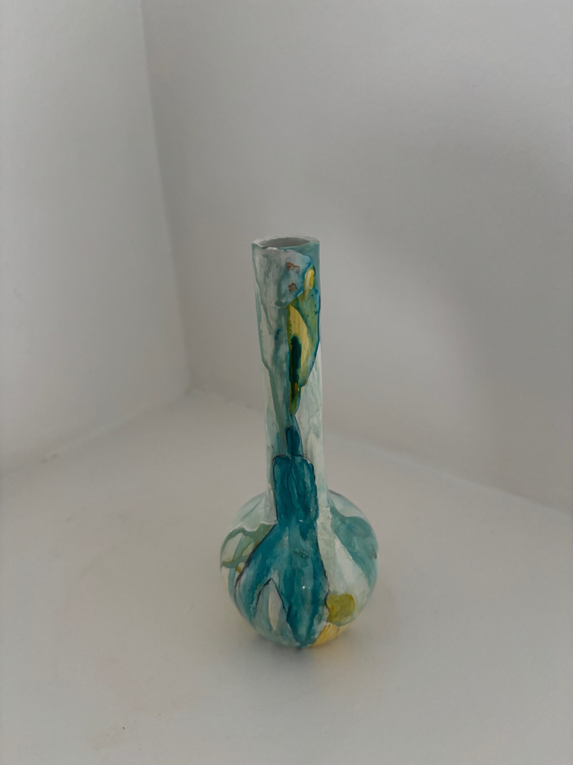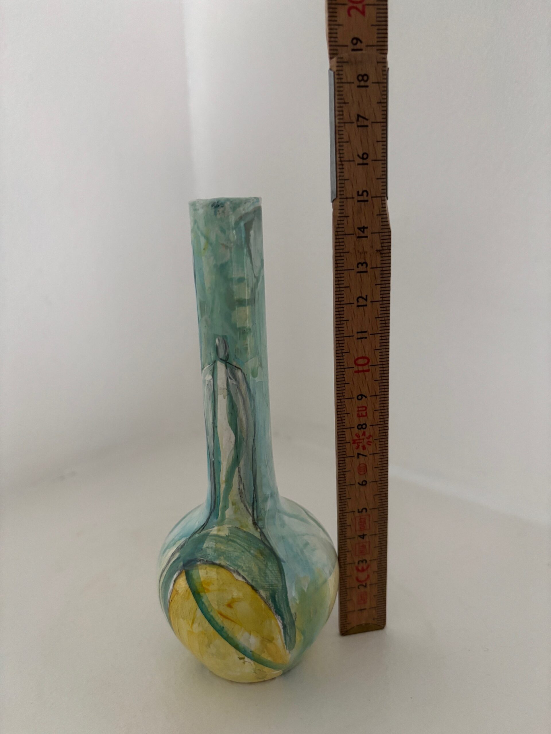 Vasen er i et farvespil med grønne, blå og gule nuancer med enkelte motiver.