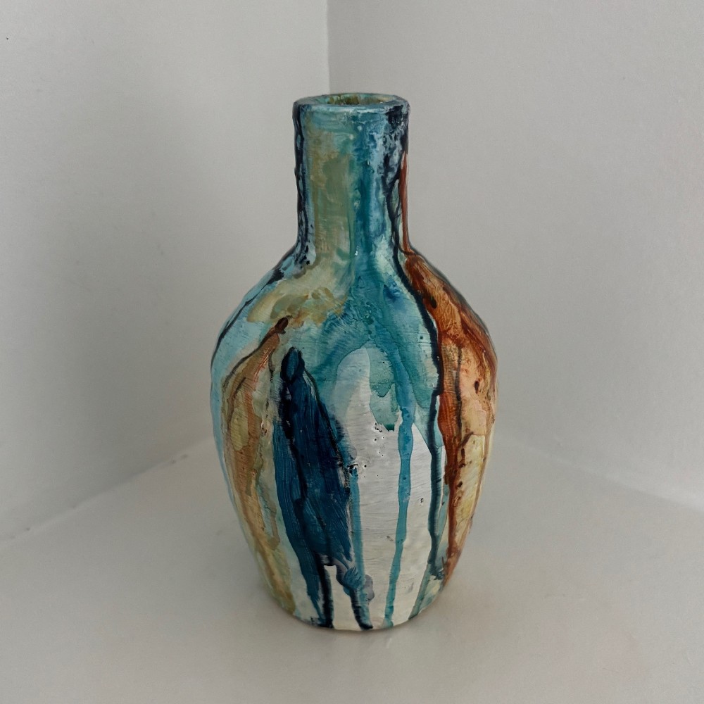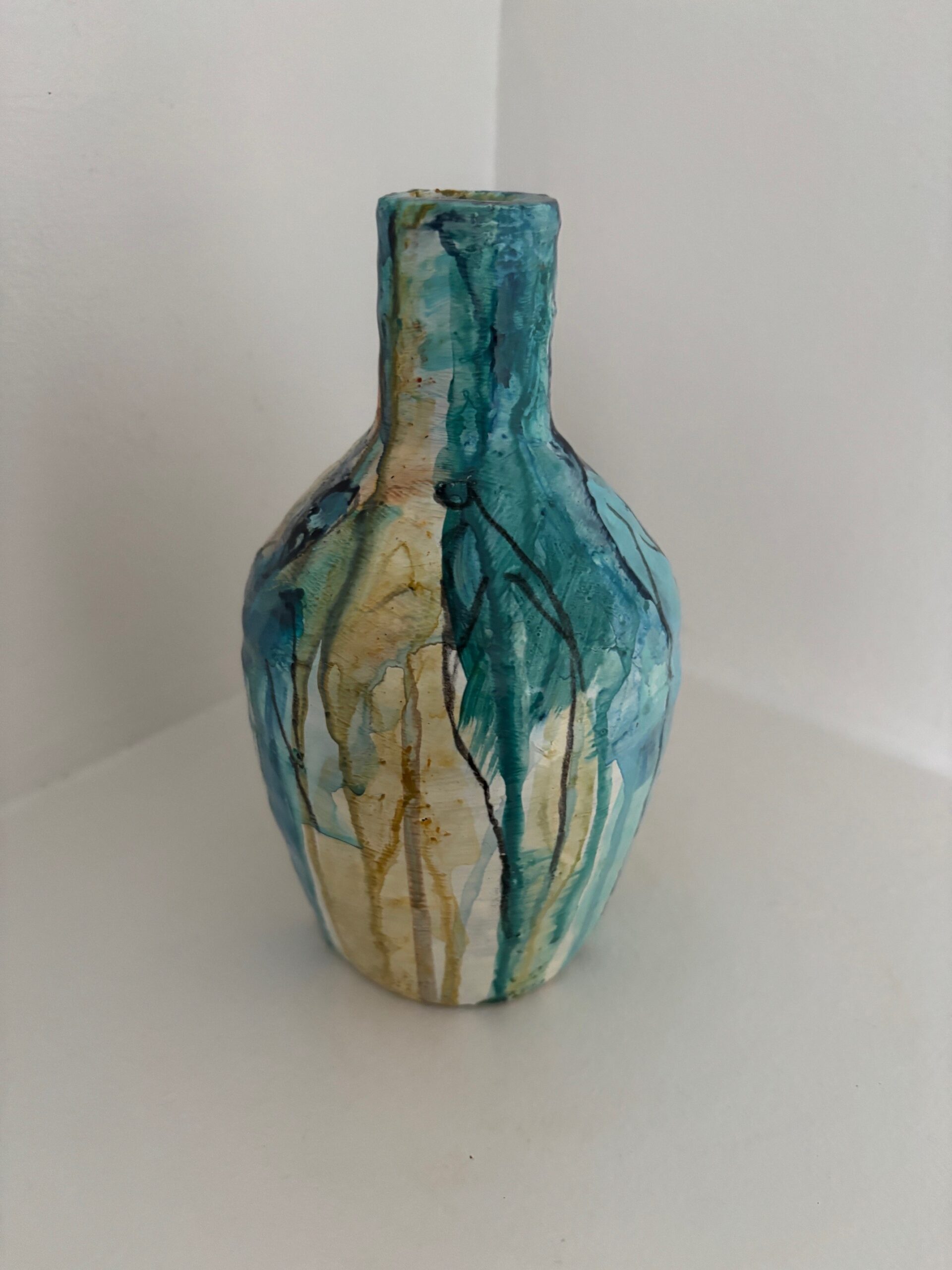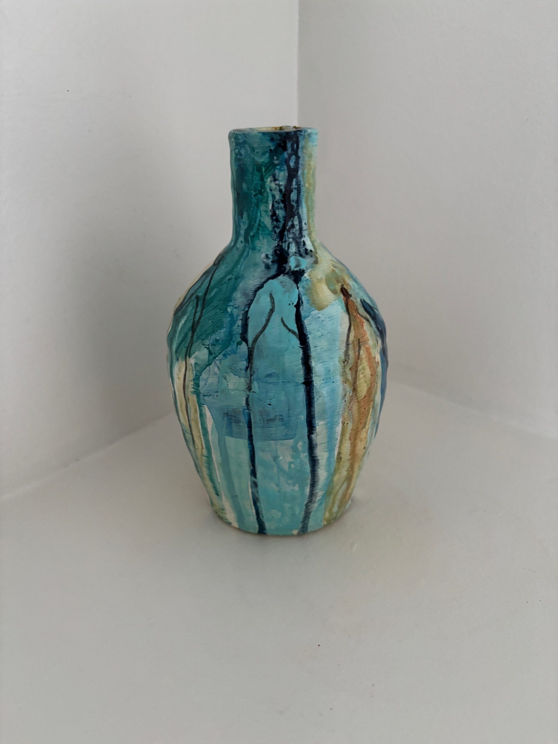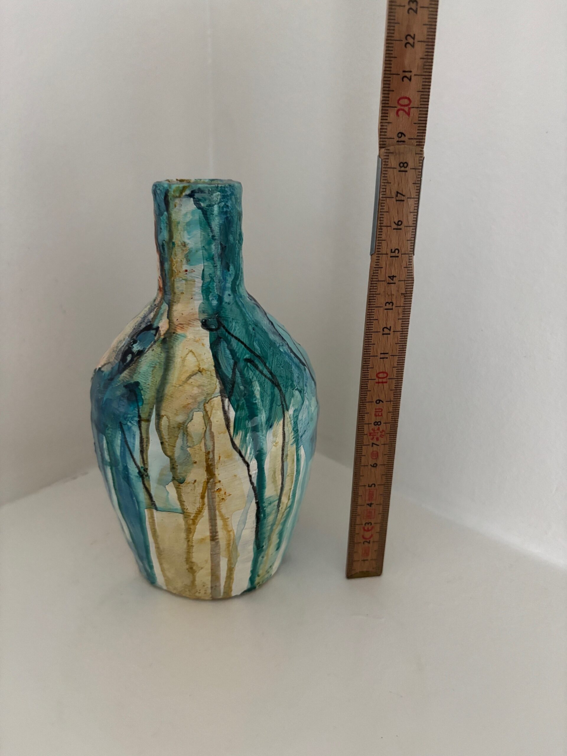 Vasen er i et farvespil med grønne, blå og orange nuancer med enkelte motiver.