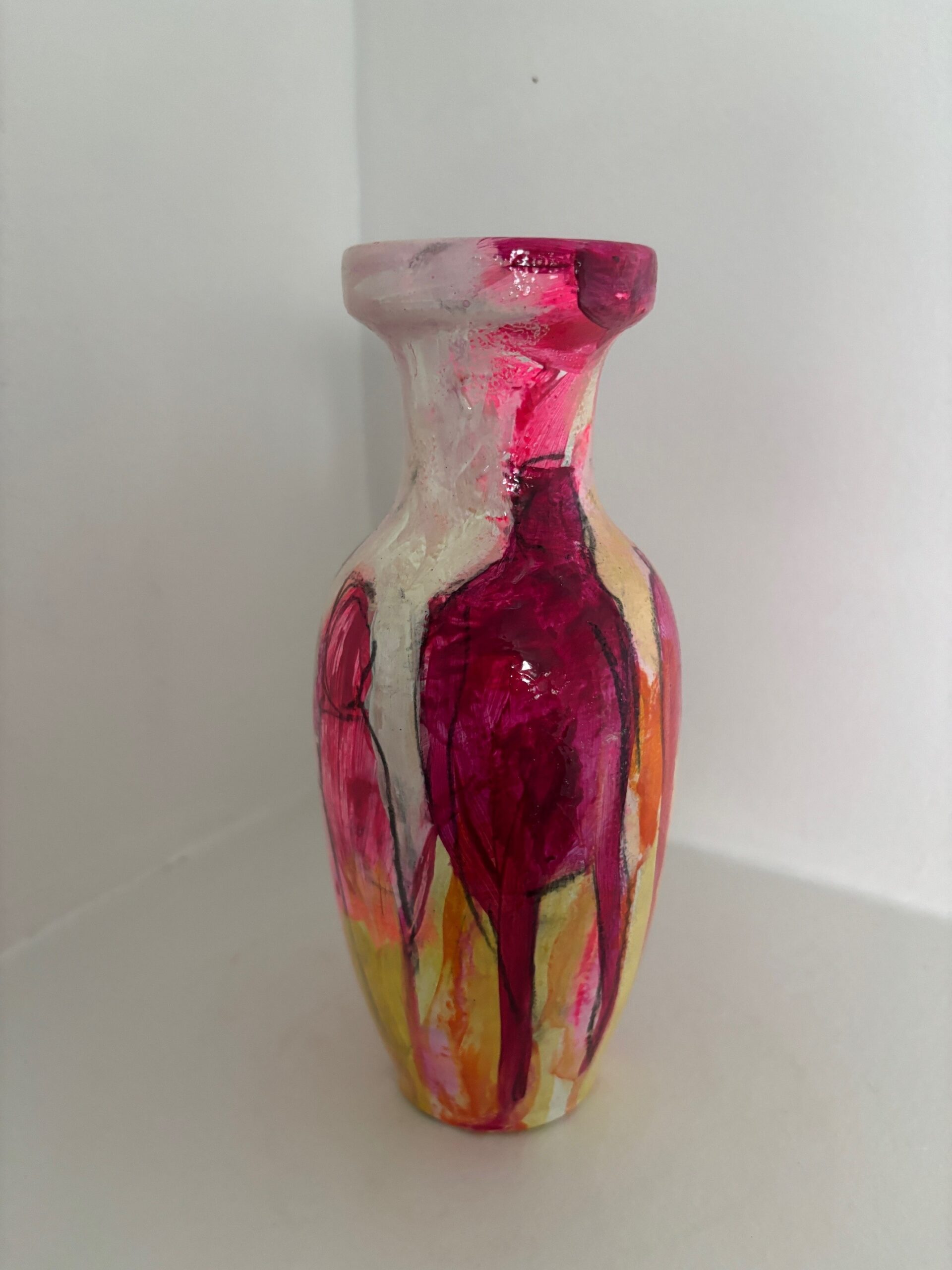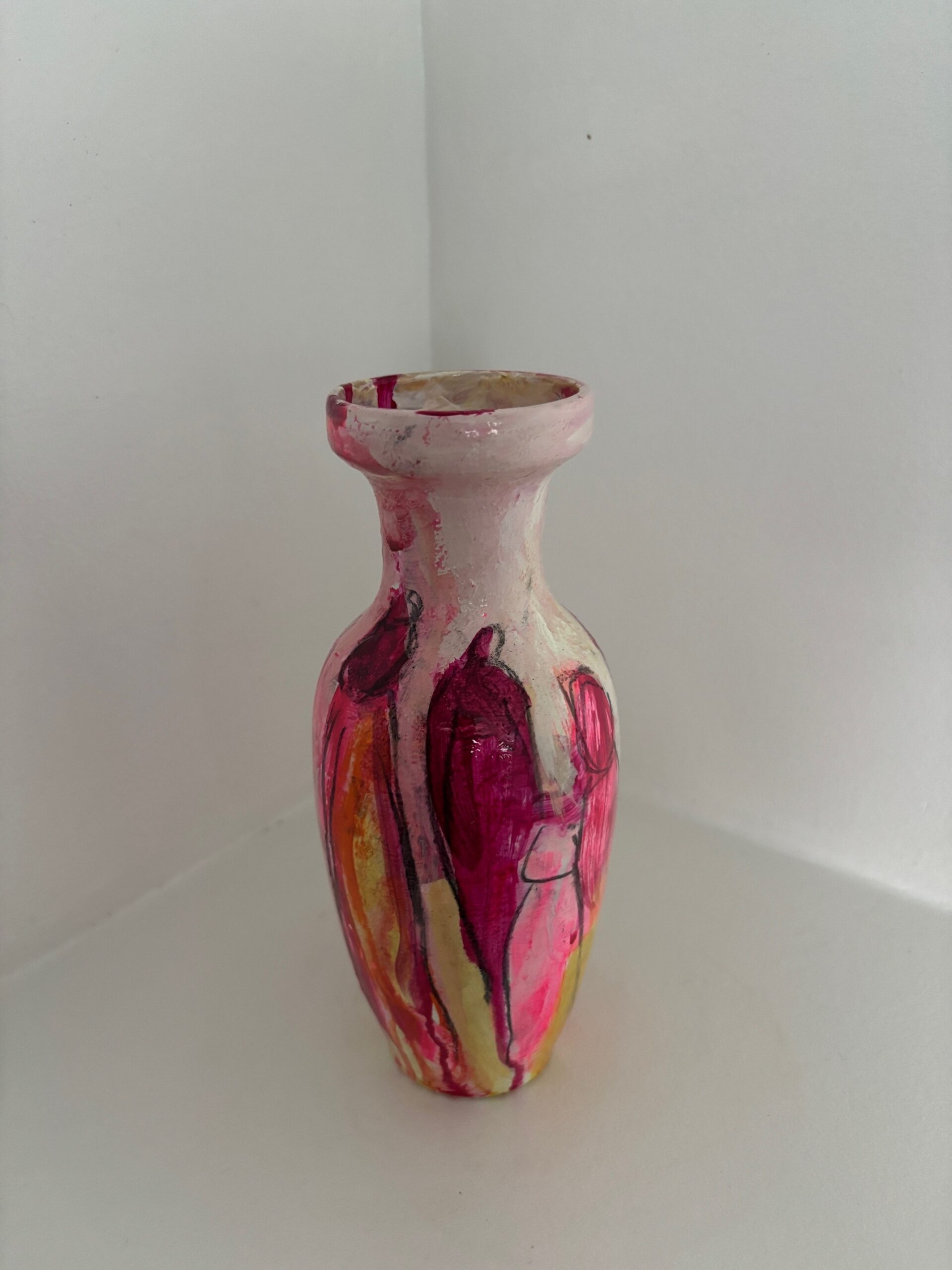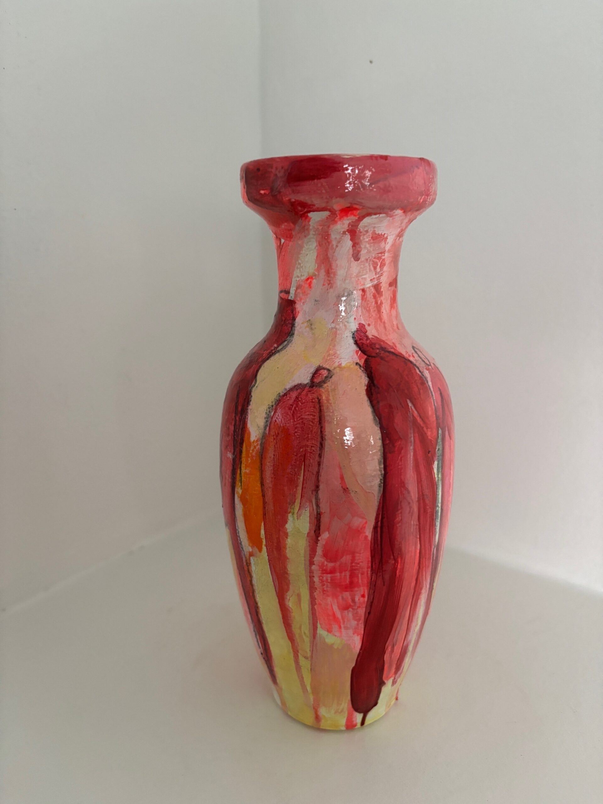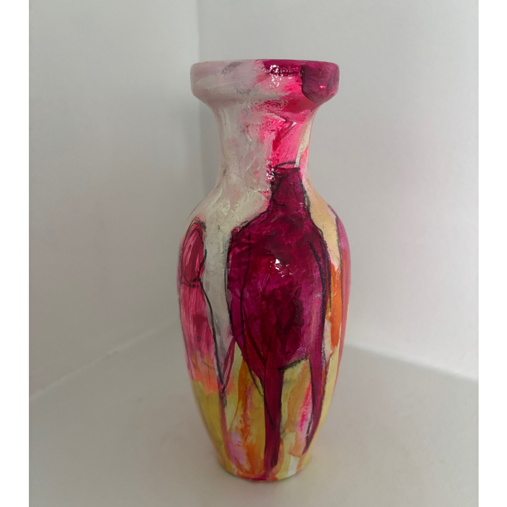 Vasen er i et farvespil med hvide, røde, lilla, pink og gule nuancer med enkelte motiver.