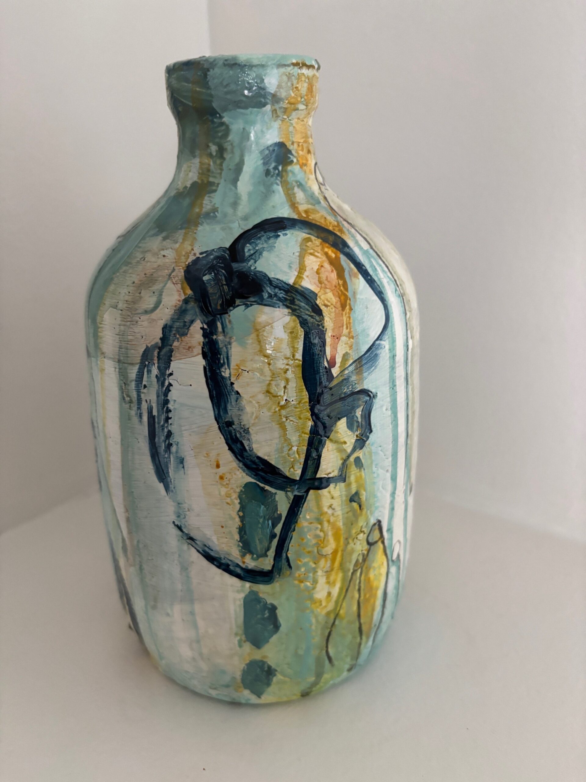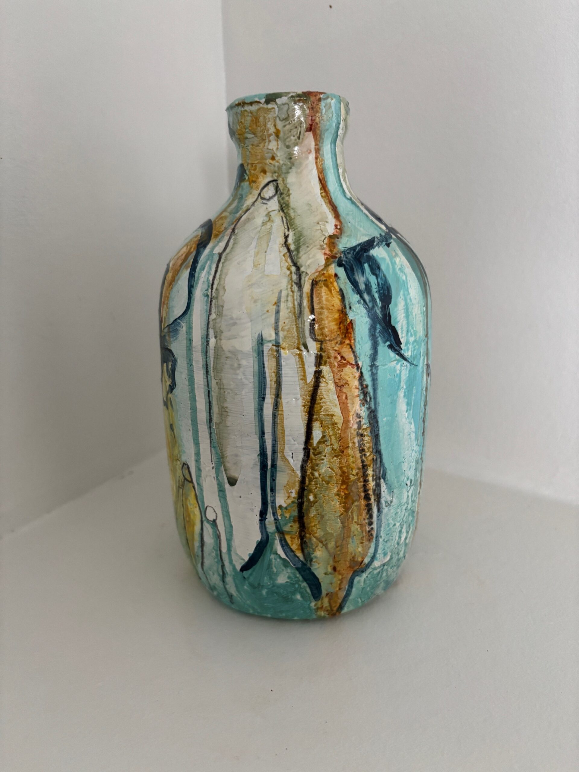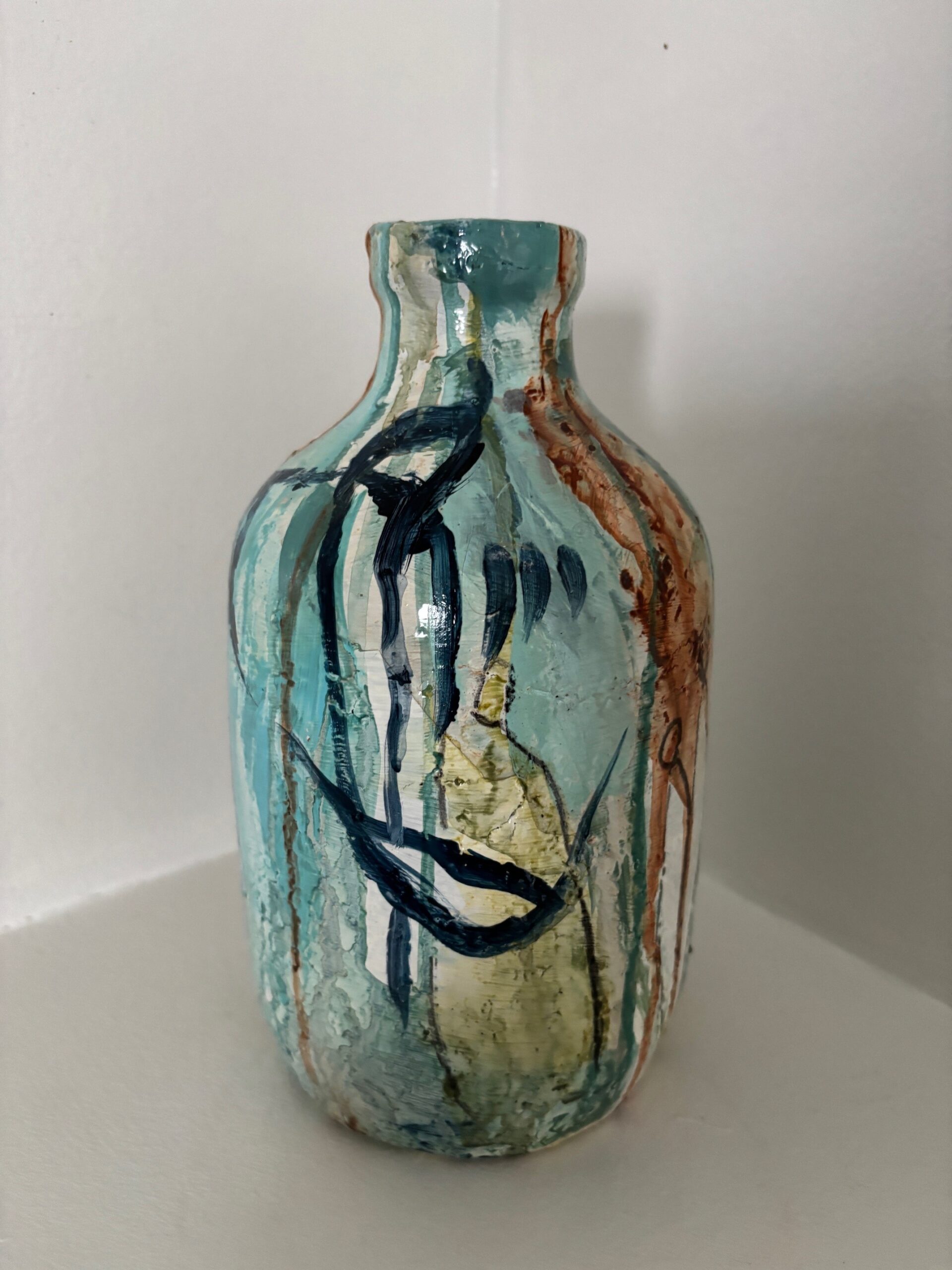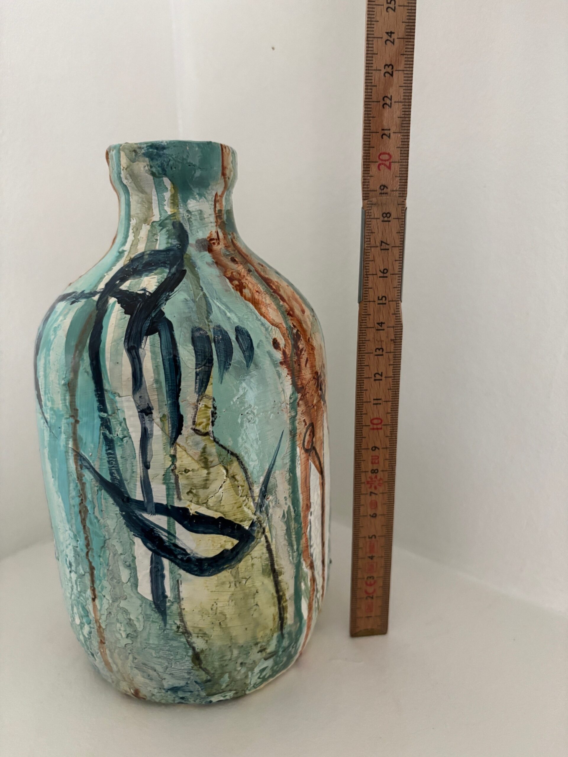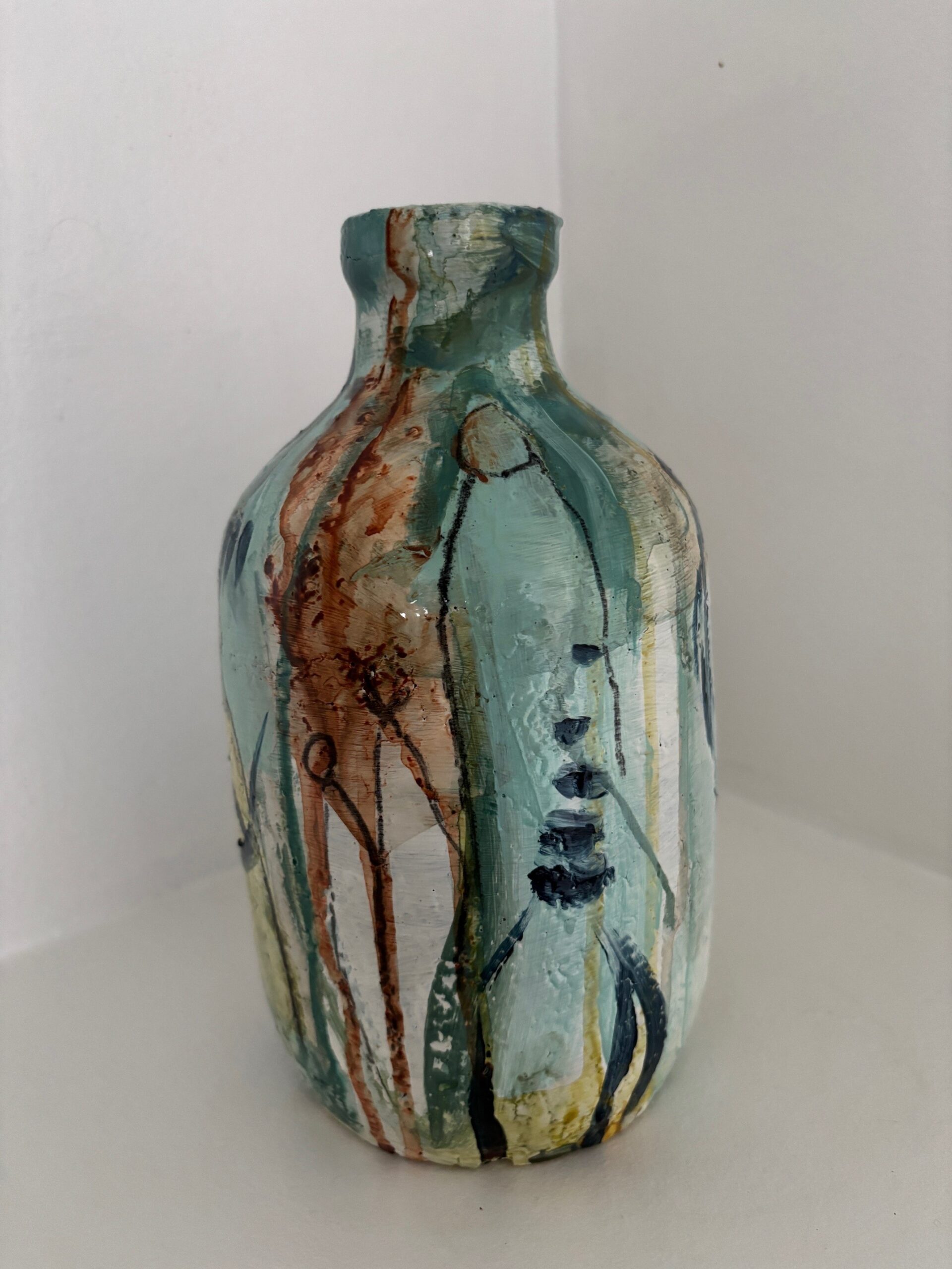 Vasen er i et farvespil med grønne, blå og orange nuancer med enkelte motiver.