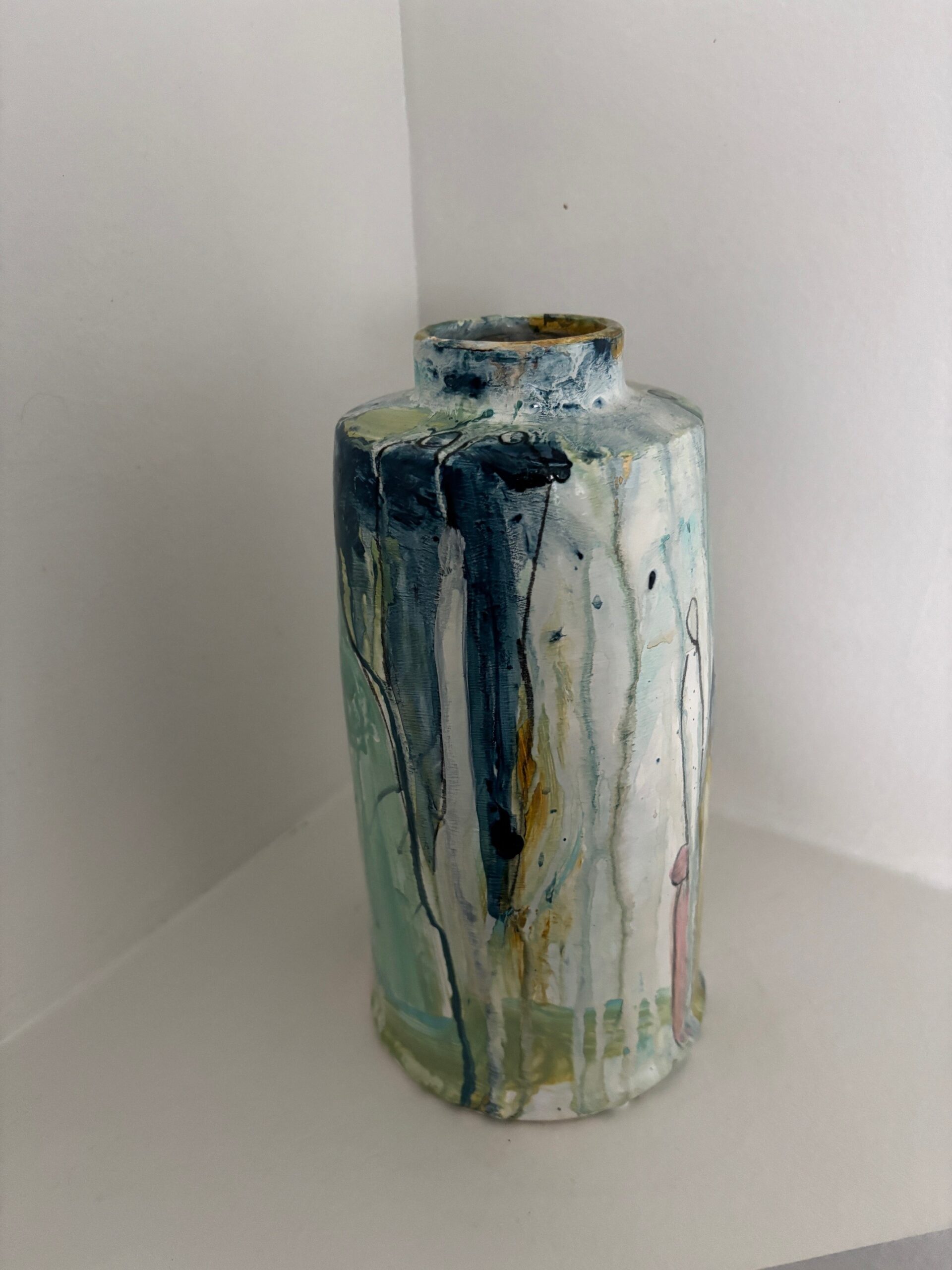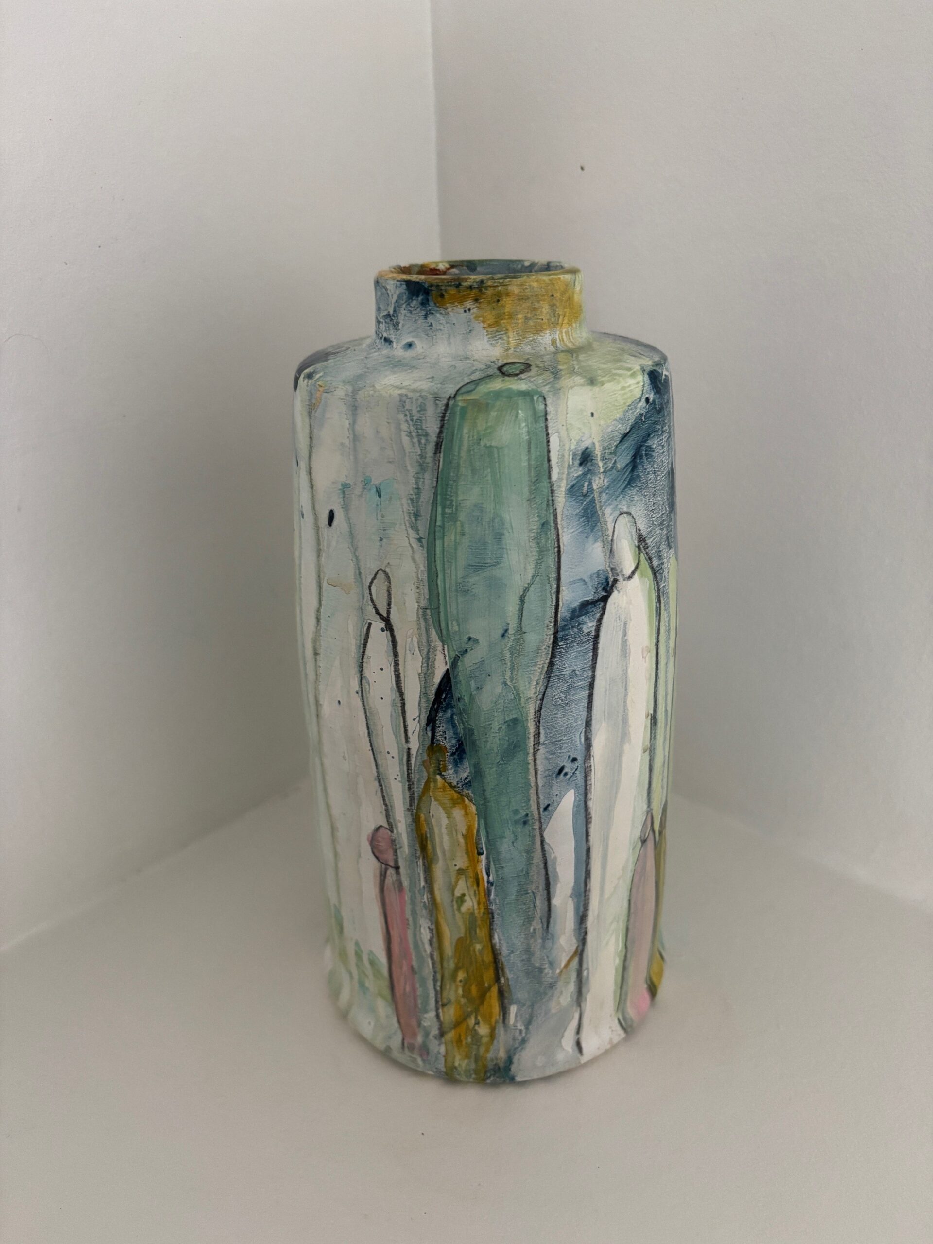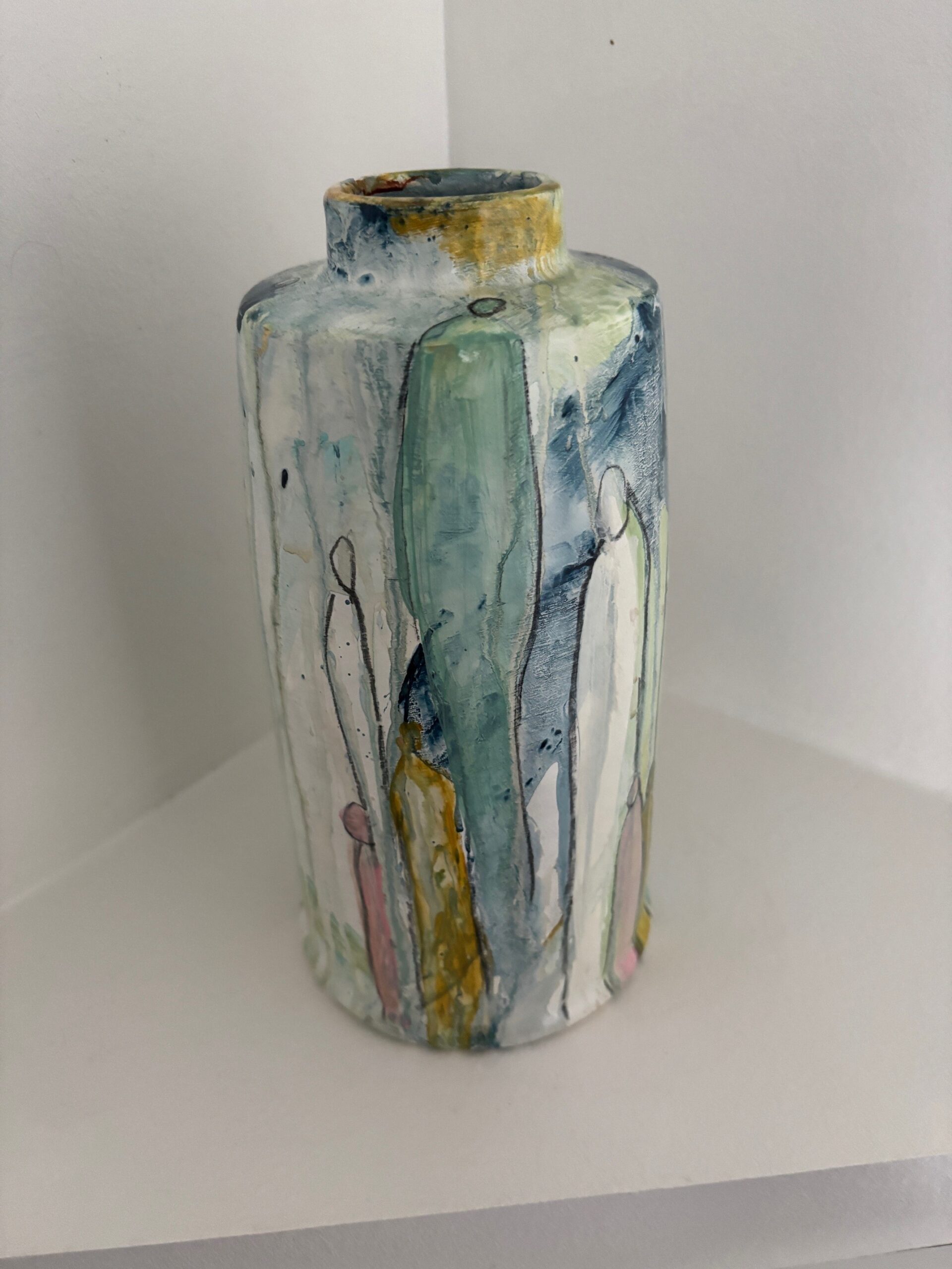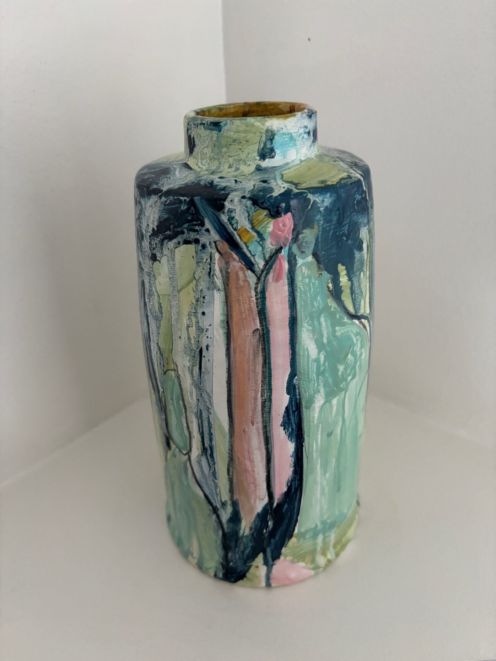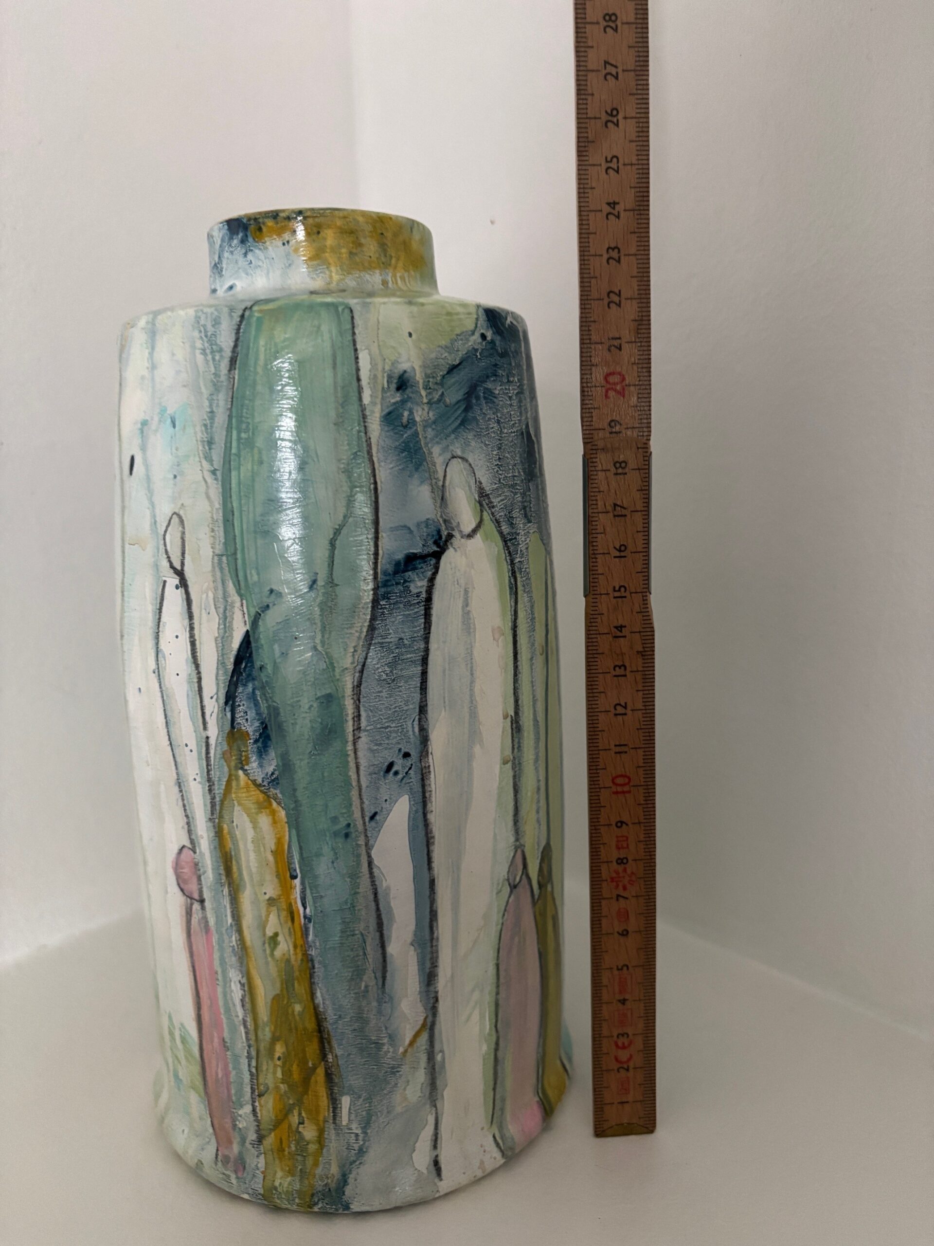 Vasen er i et farvespil med grønne, blå, gule og lyserøde nuancer med enkelte motiver.