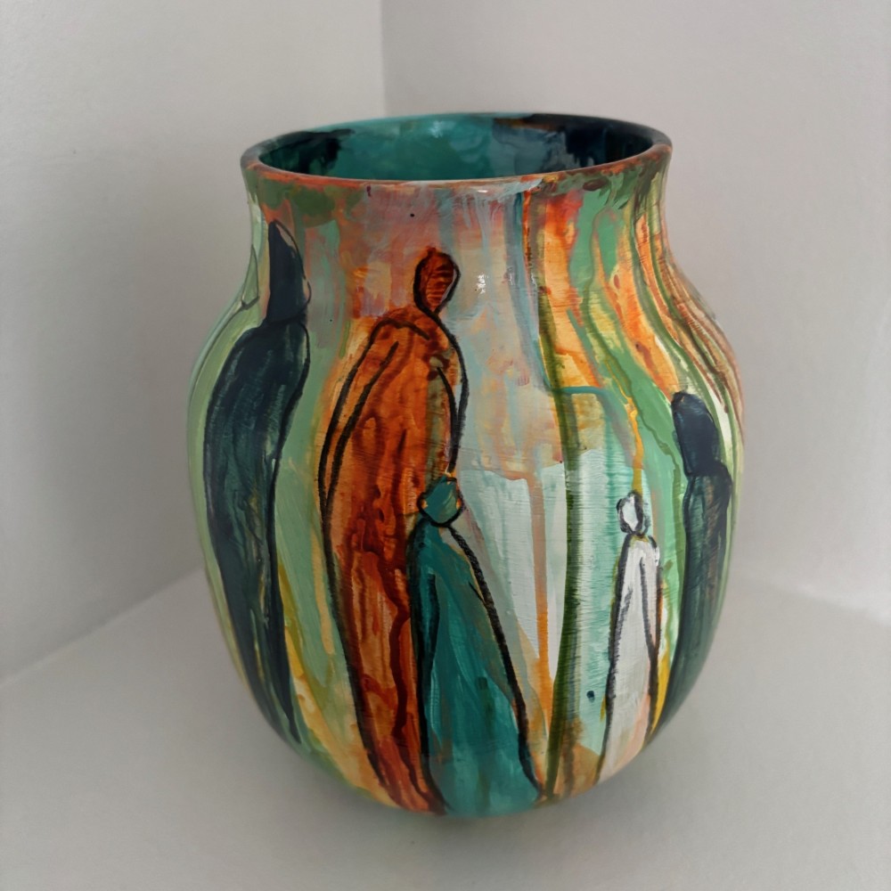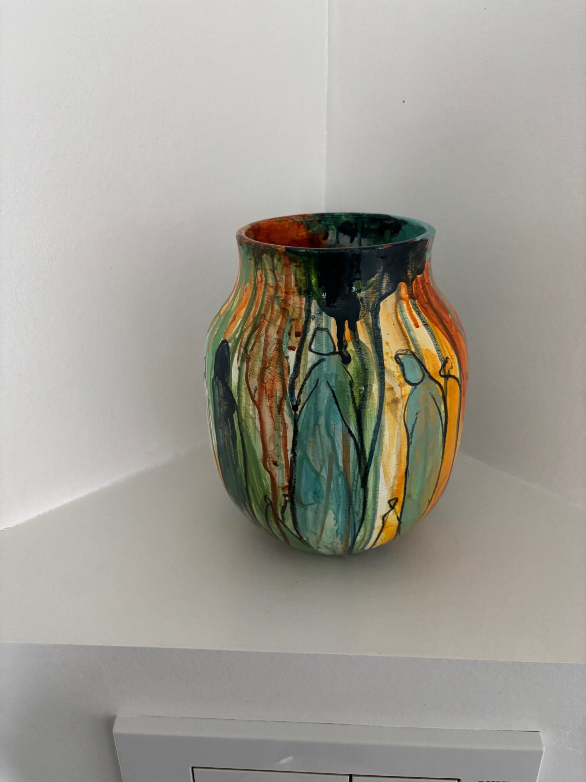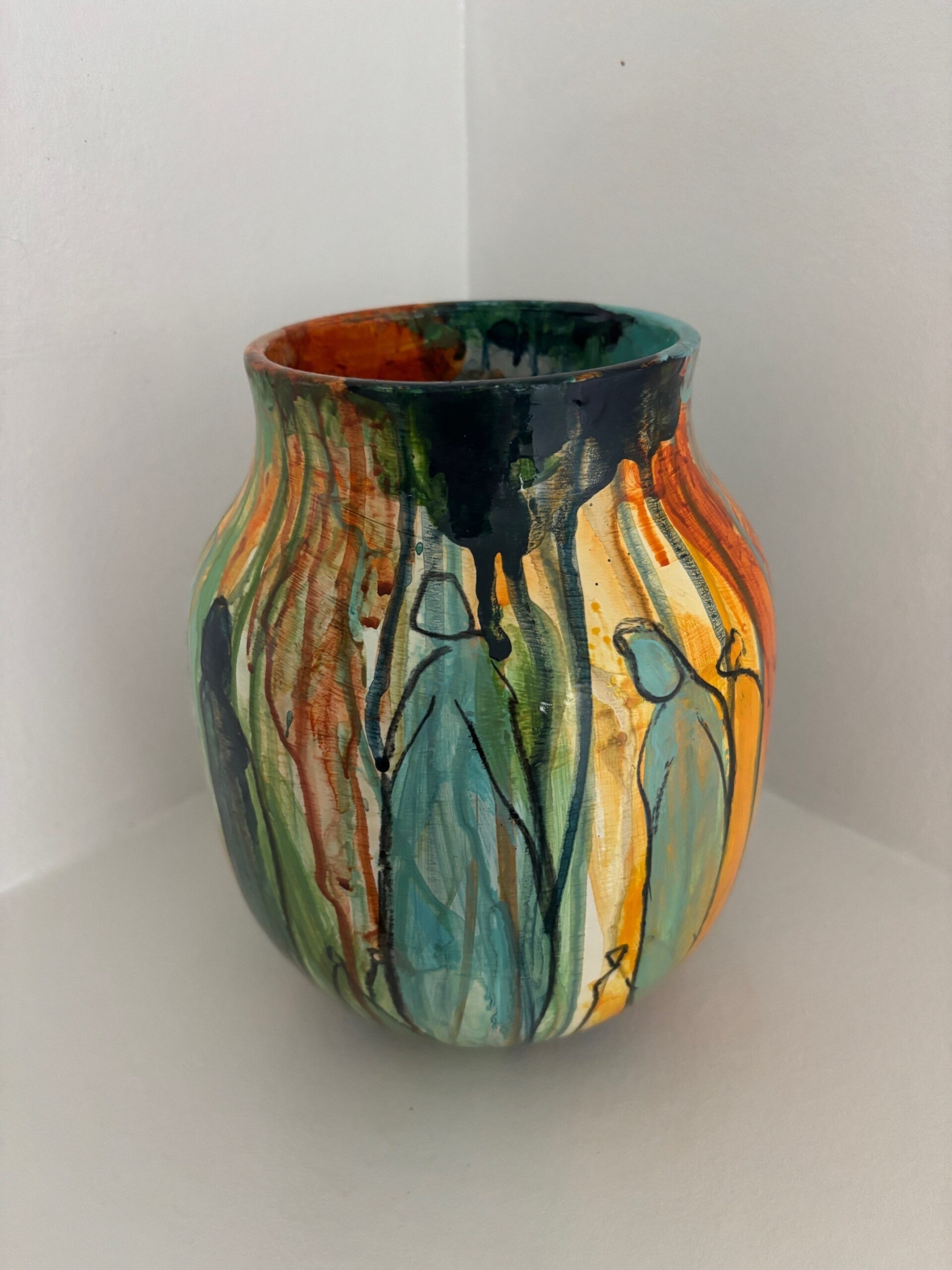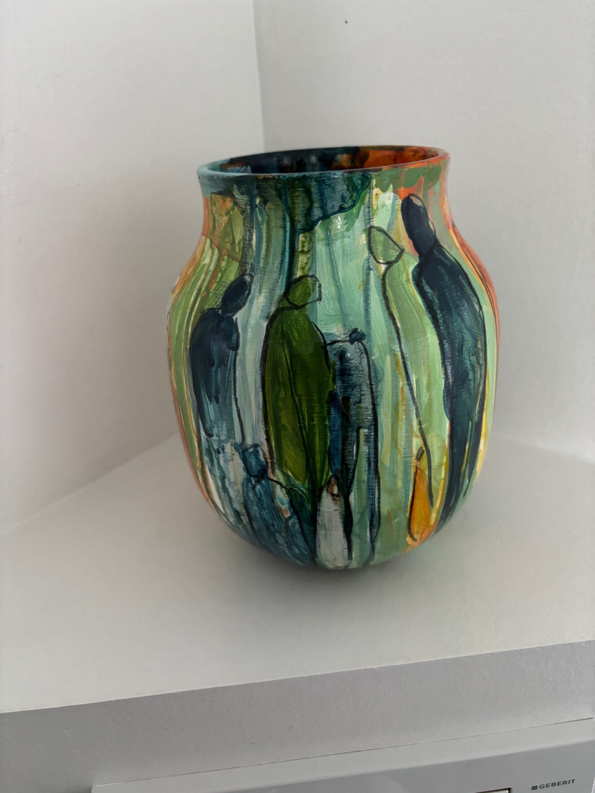 Vasen er i et farvespil med grønne, blå og orange nuancer med enkelte motiver.