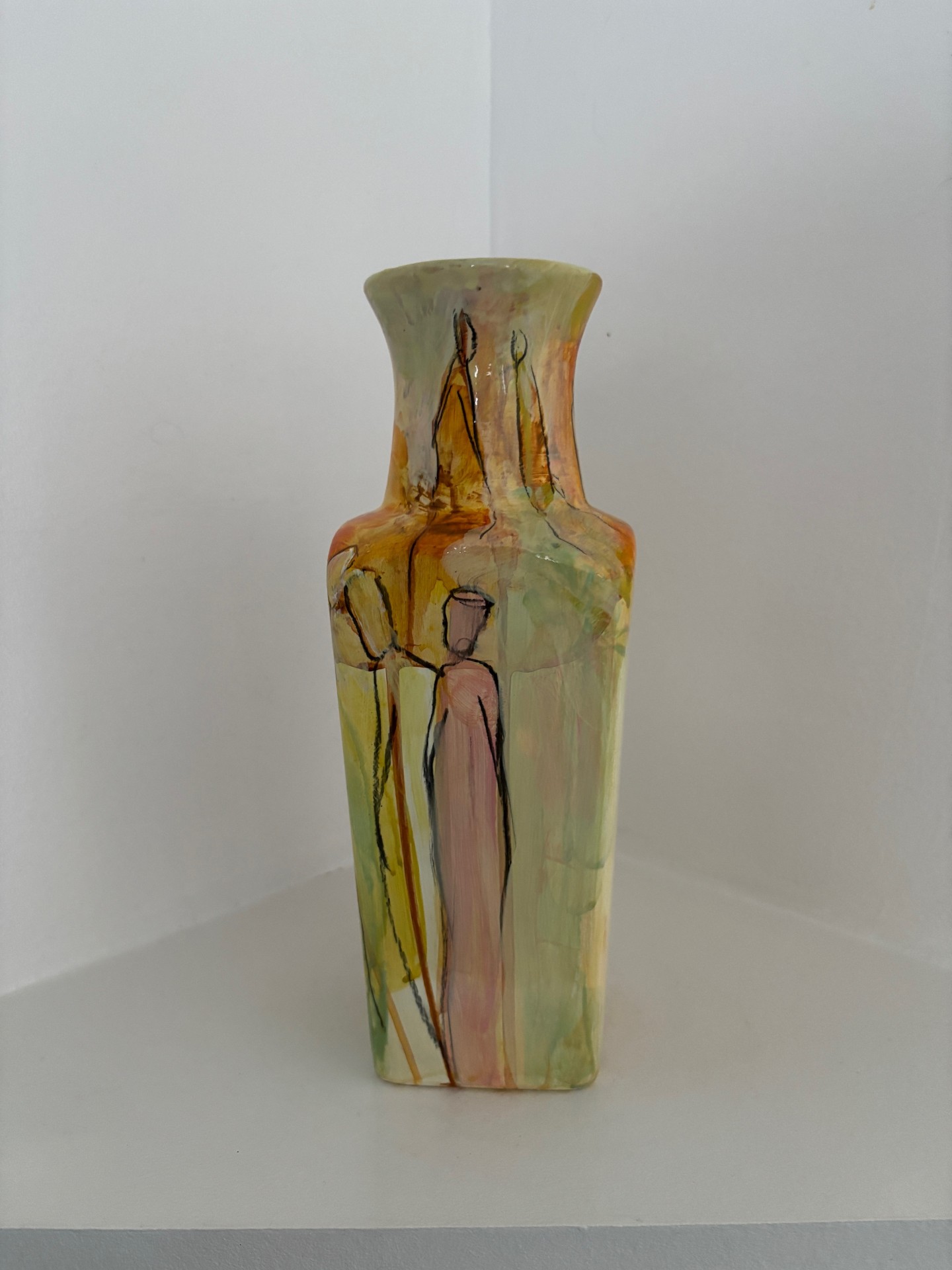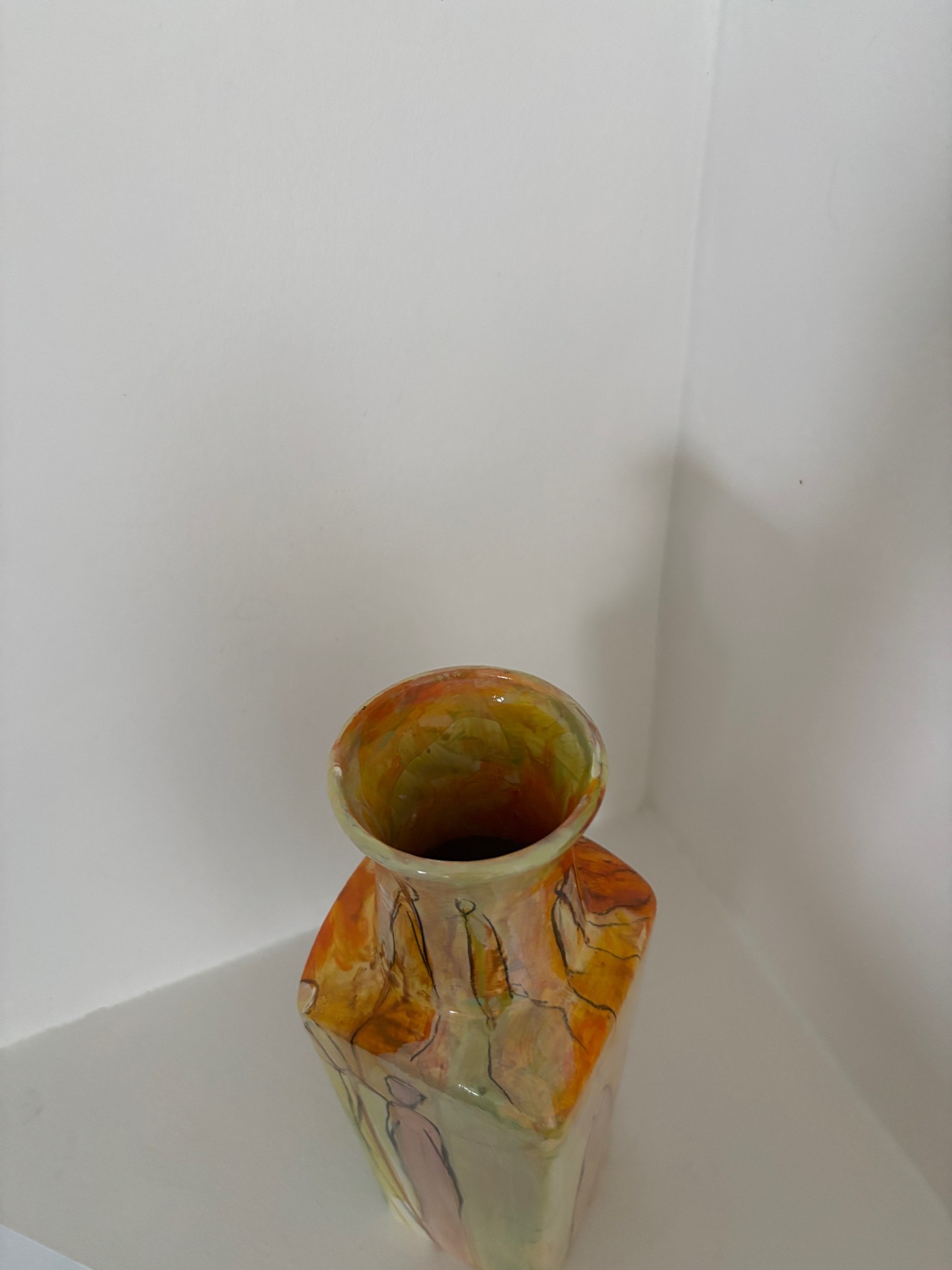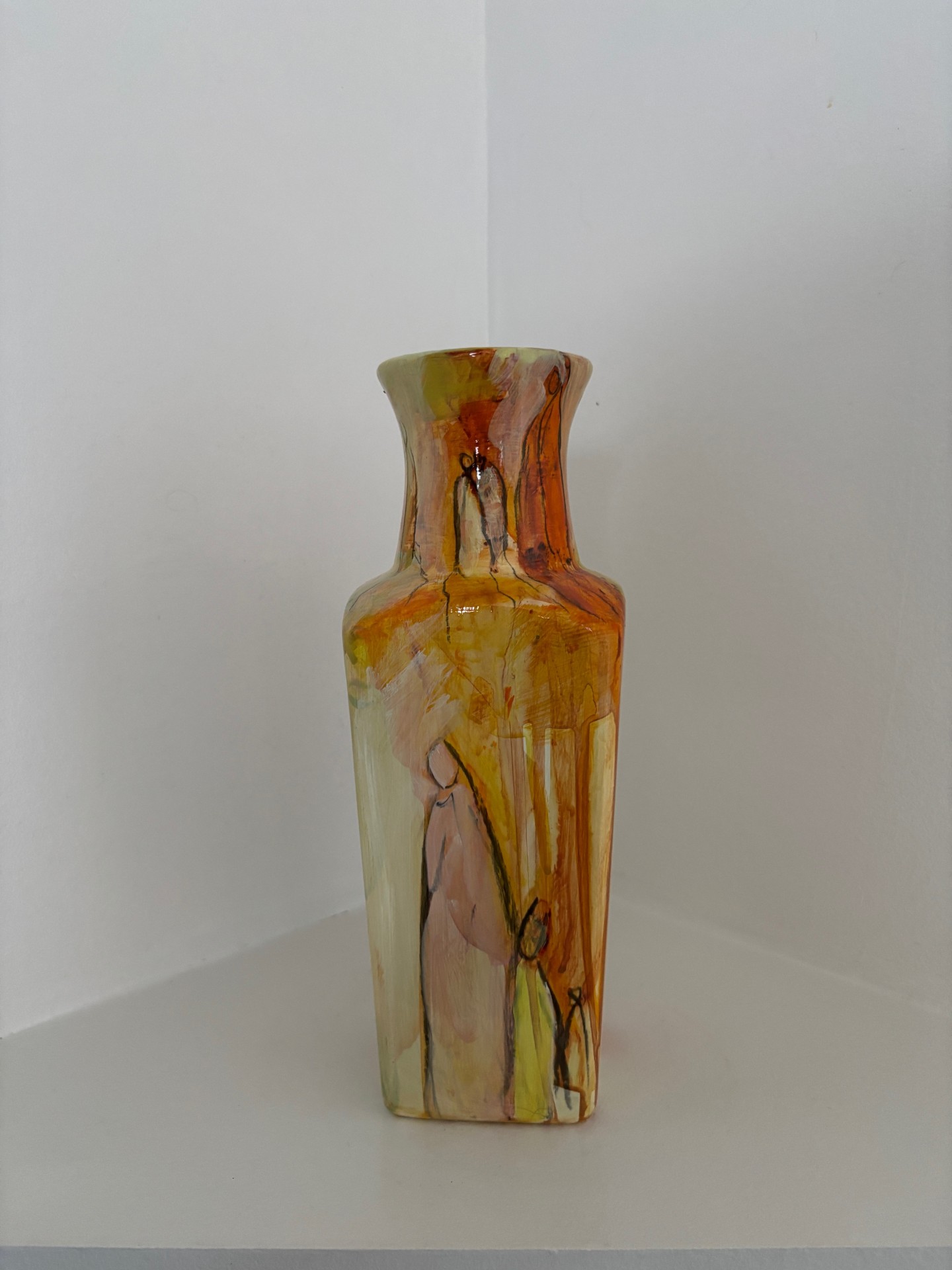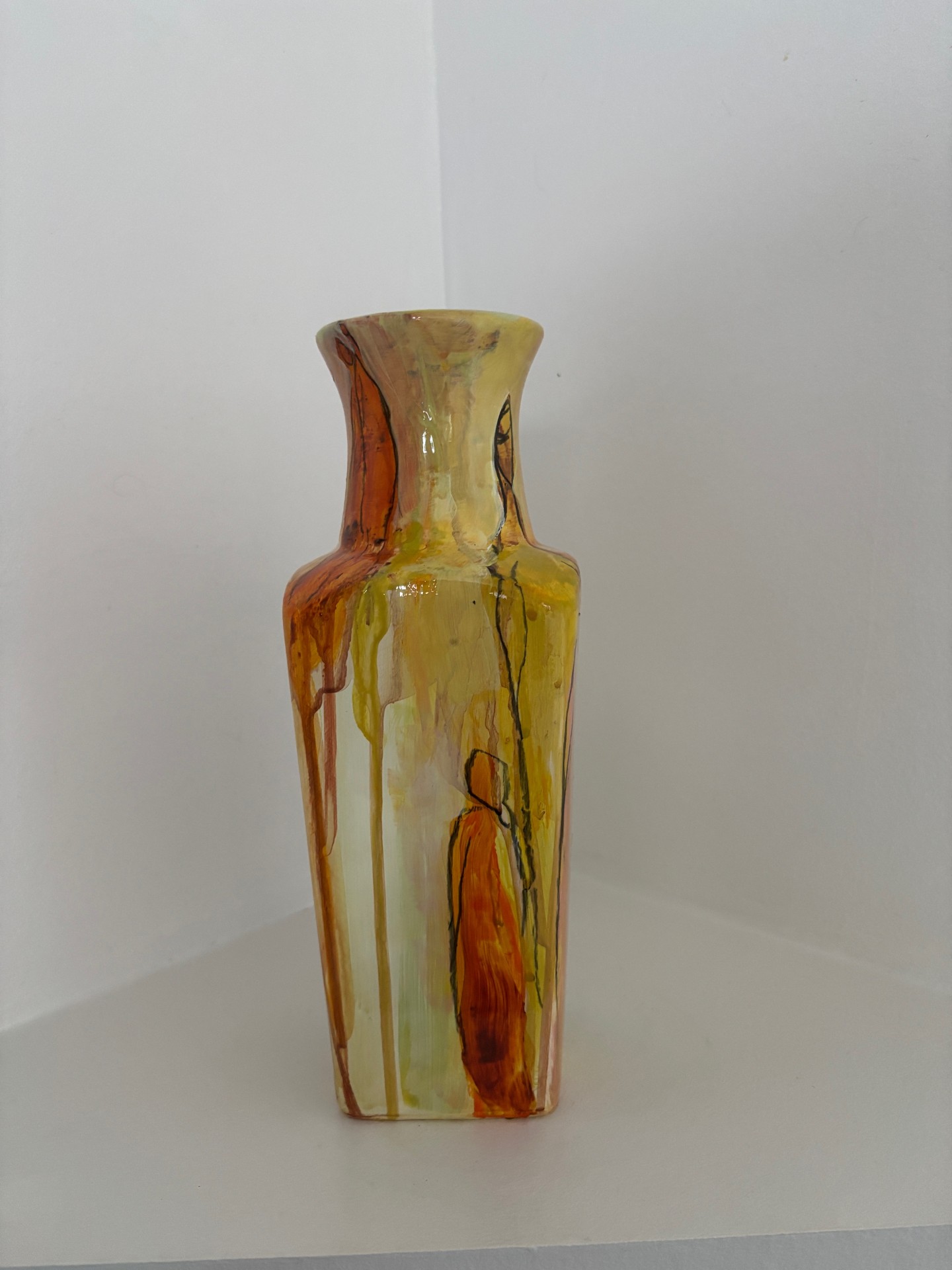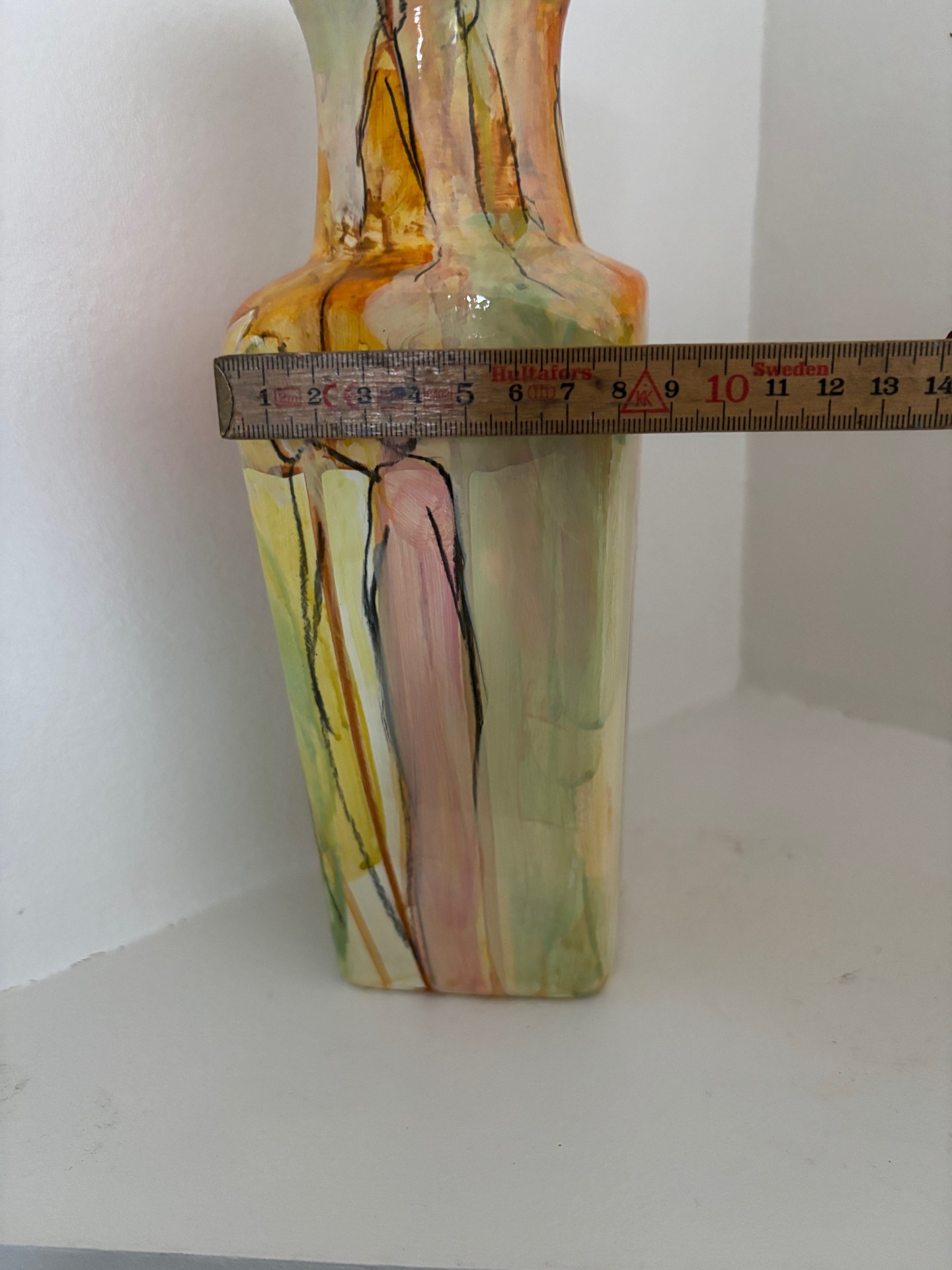 Vasen er i et farvespil med, gule og orange nuancer med enkelte motiver.