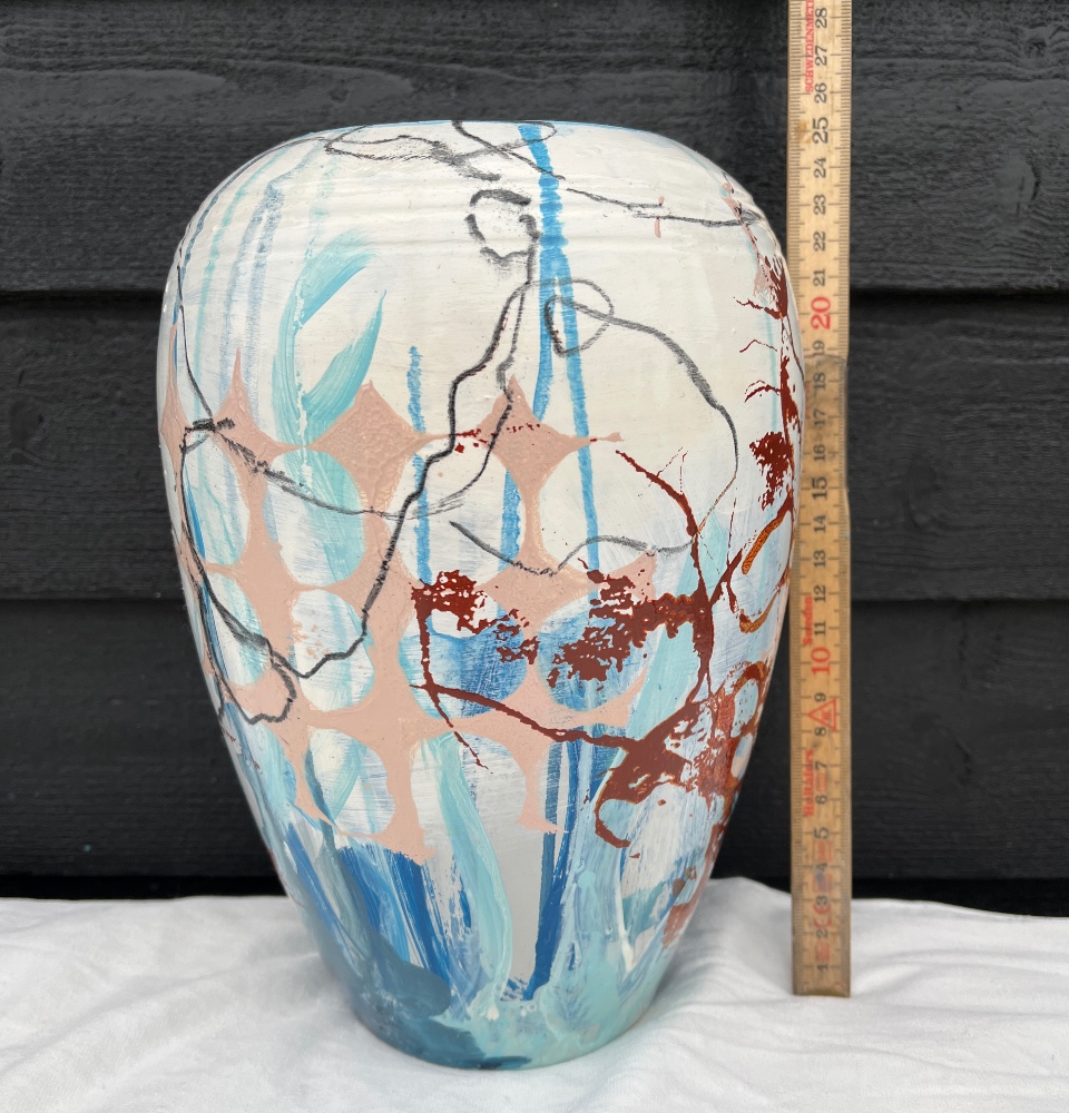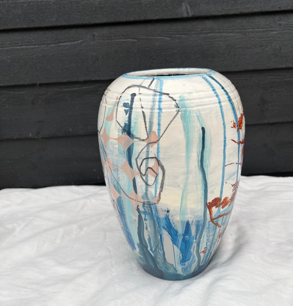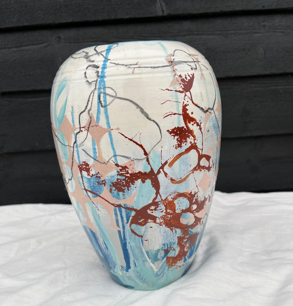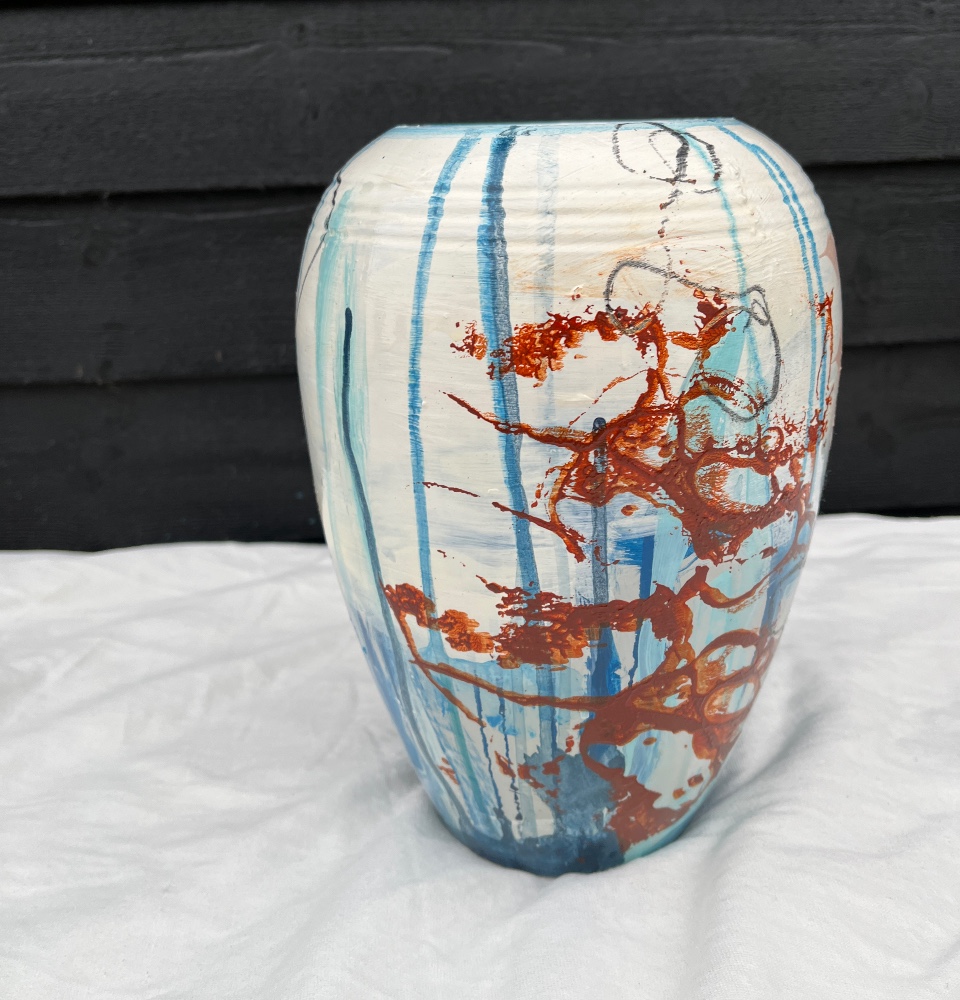 Vasen er i blålige nuancer med farvespil i orange-brunlige strøg på hvid baggrund.
