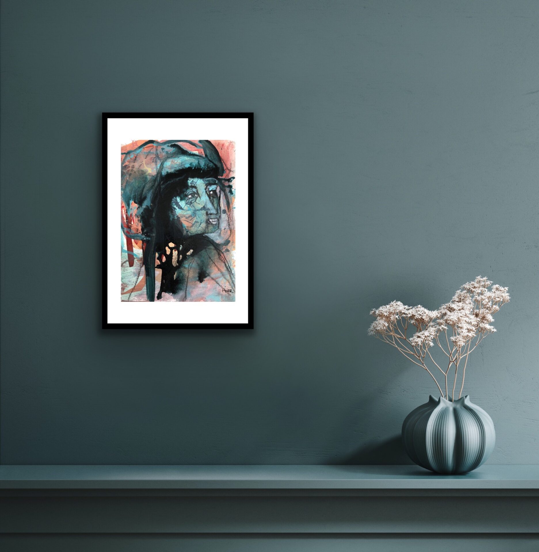 Monteret i passpartout og sort træramme med akryl glas.